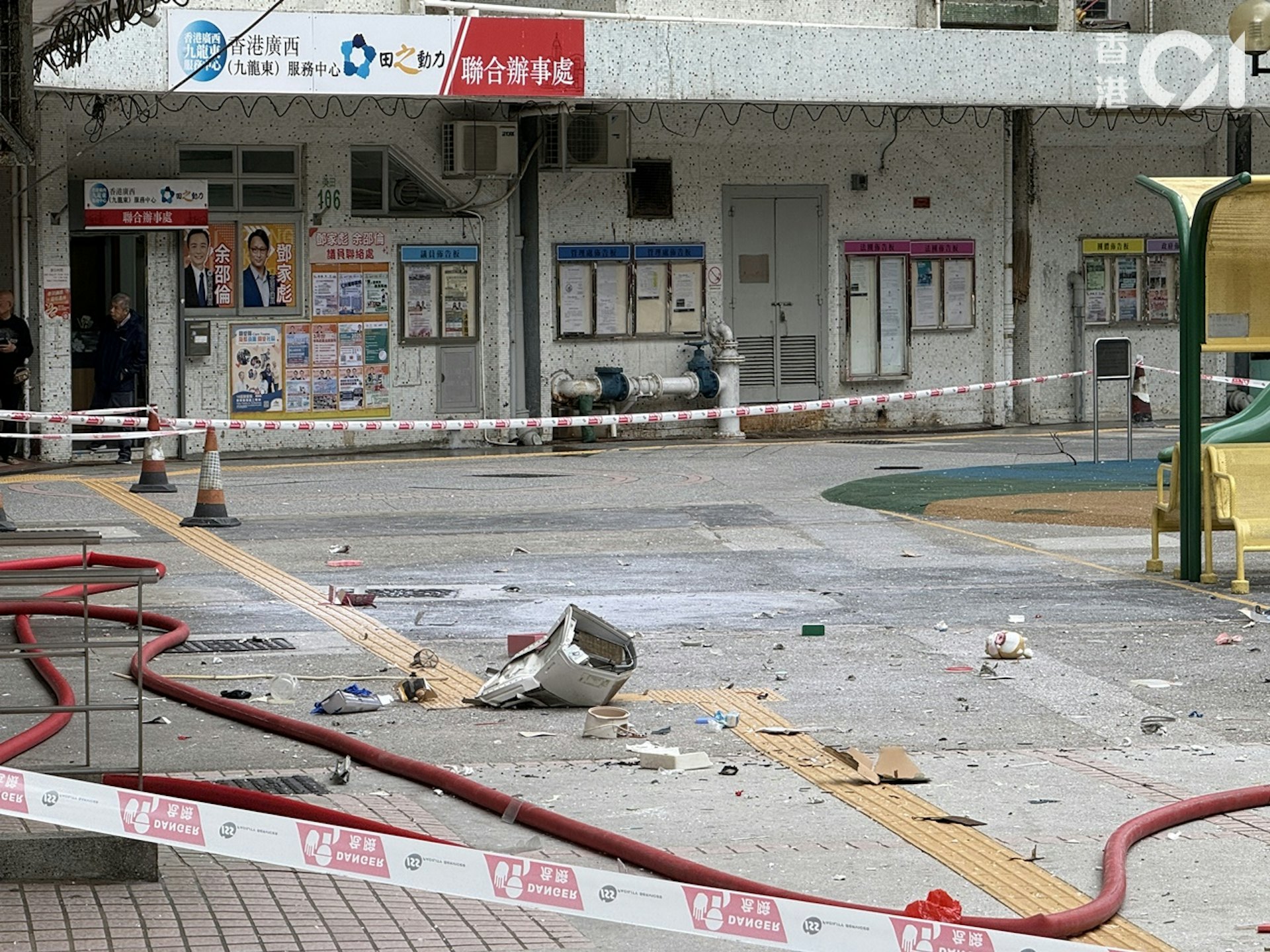 7 r0 }4 D4 ]& d2 F5 O: D; m大量碎片飛散街上,包括冷氣機及窗框等。(羅日昇攝)