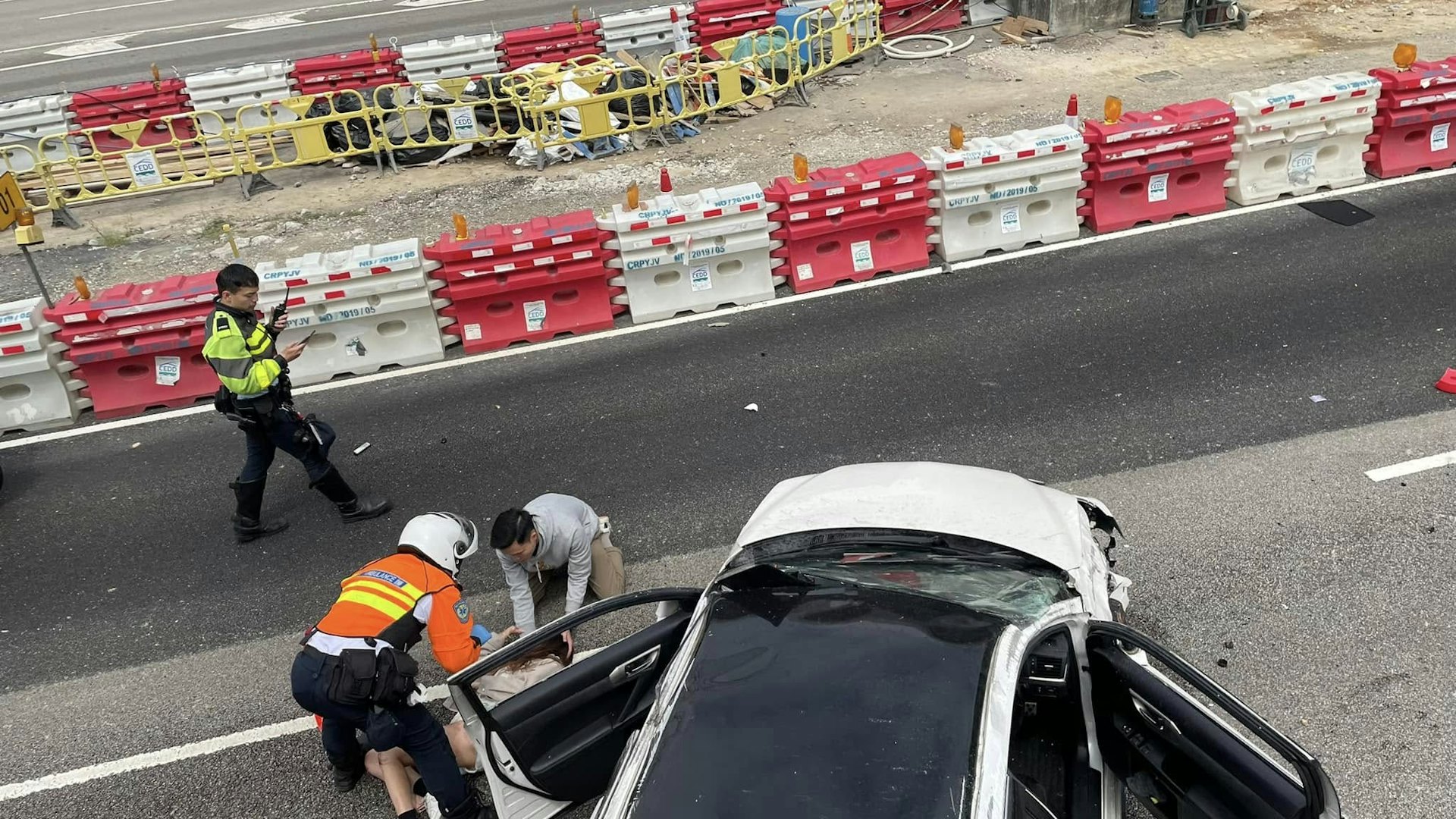 白色私家車上一名女子受傷,熱心人士上前協助。(青衣街坊吹水會/Hazukasi Suen圖片)