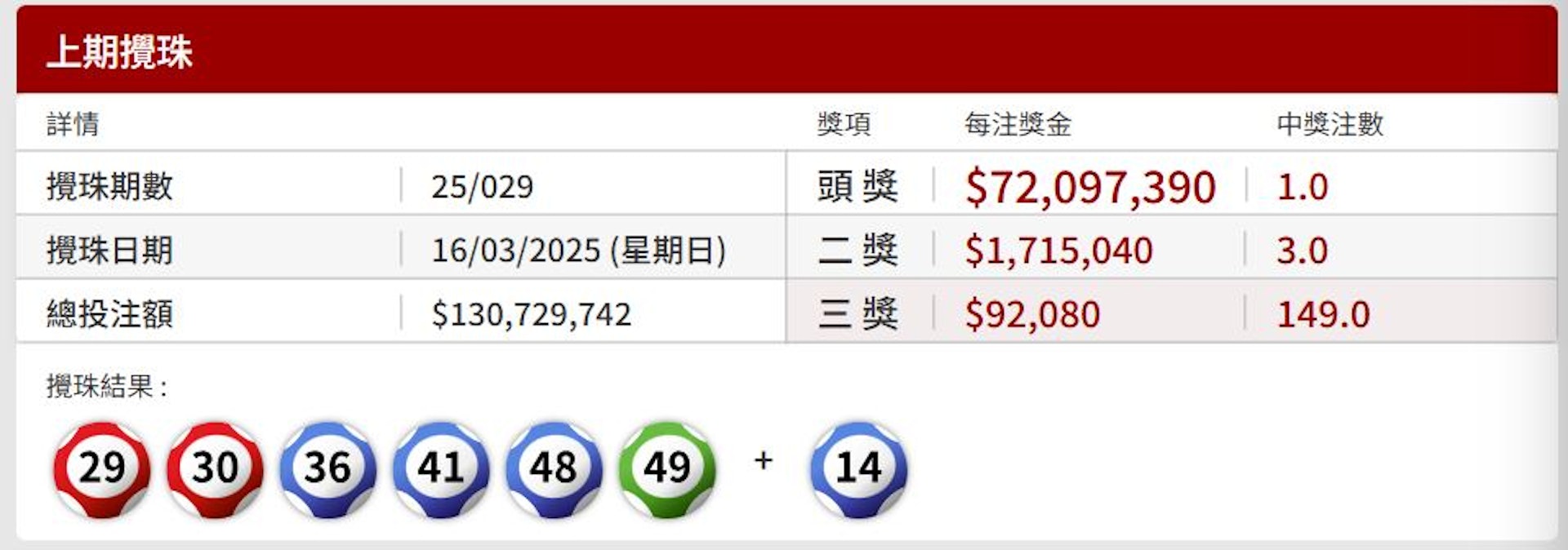 2025年第29期六合彩攪珠結果周日(3月16日)出爐,攪出號碼是29號、30號、36號、41號、48號、49號,特別號碼14號。頭獎1注中,每注派72,097,390元;2獎3注中,每注派1,715,040元;三獎149注中,每注派92,080元。