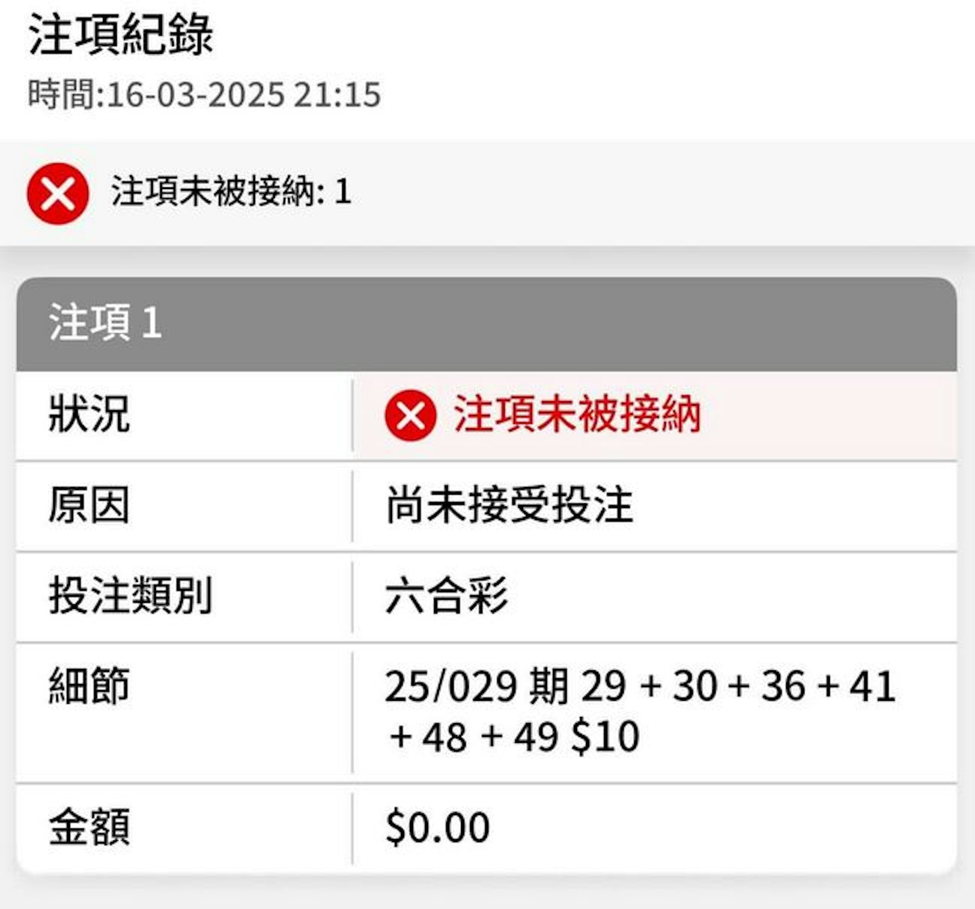 截圖看到,他選了29號、30號、36號、41號、48號、49號這6個號碼,與頭獎攪出號碼相同,購買時間是2025年3月16日21時15分(晚上9時15分)。惟由於晚上9時15分已到六合彩截止投注時間,他選中的號碼未能成功落注,截圖亦顯示「注項未被接納」、「尚未接受投注」,與頭獎「擦身而過」。
