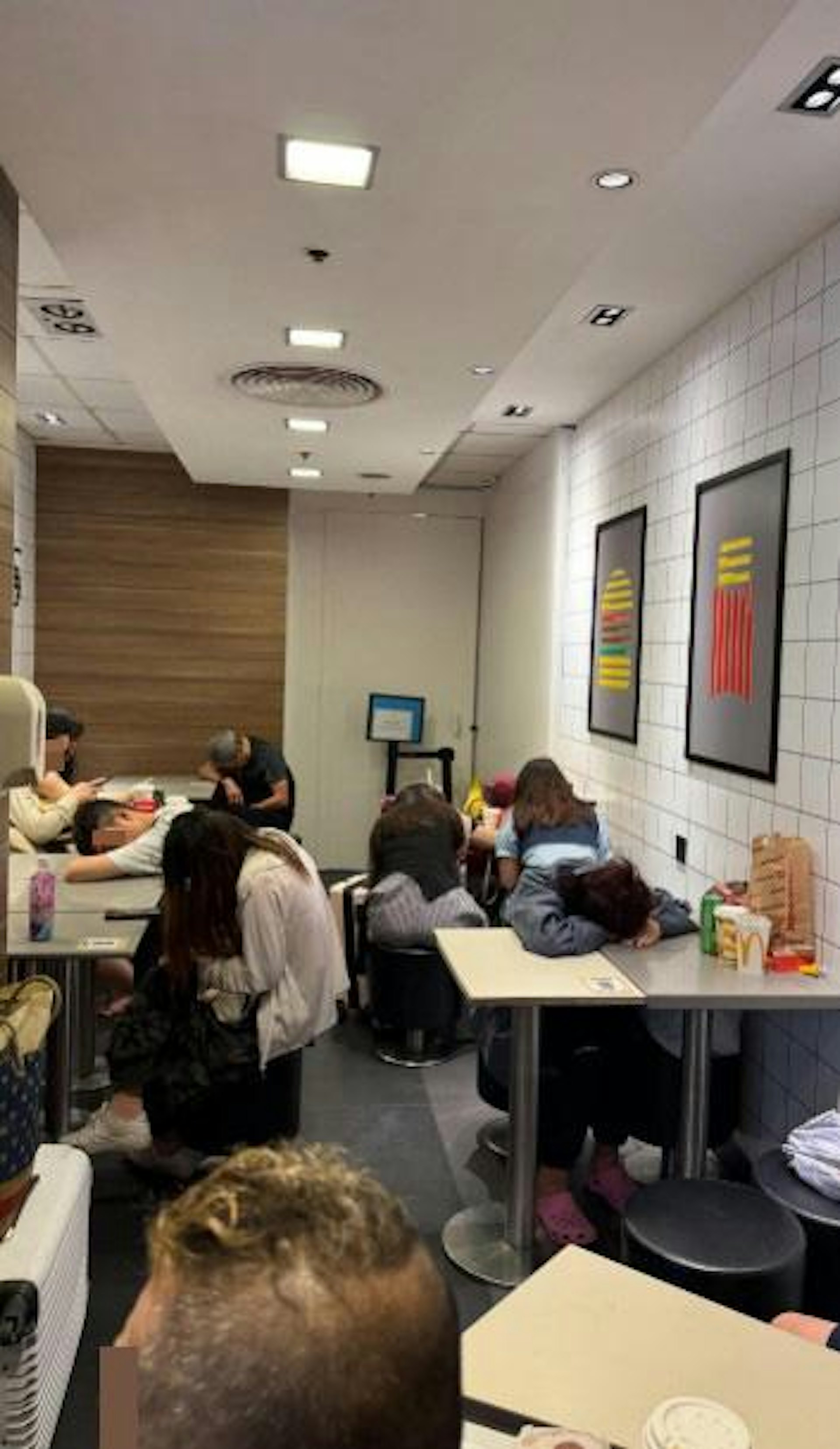 大批帶行李箱旅客霸佔麥當勞座位睡覺