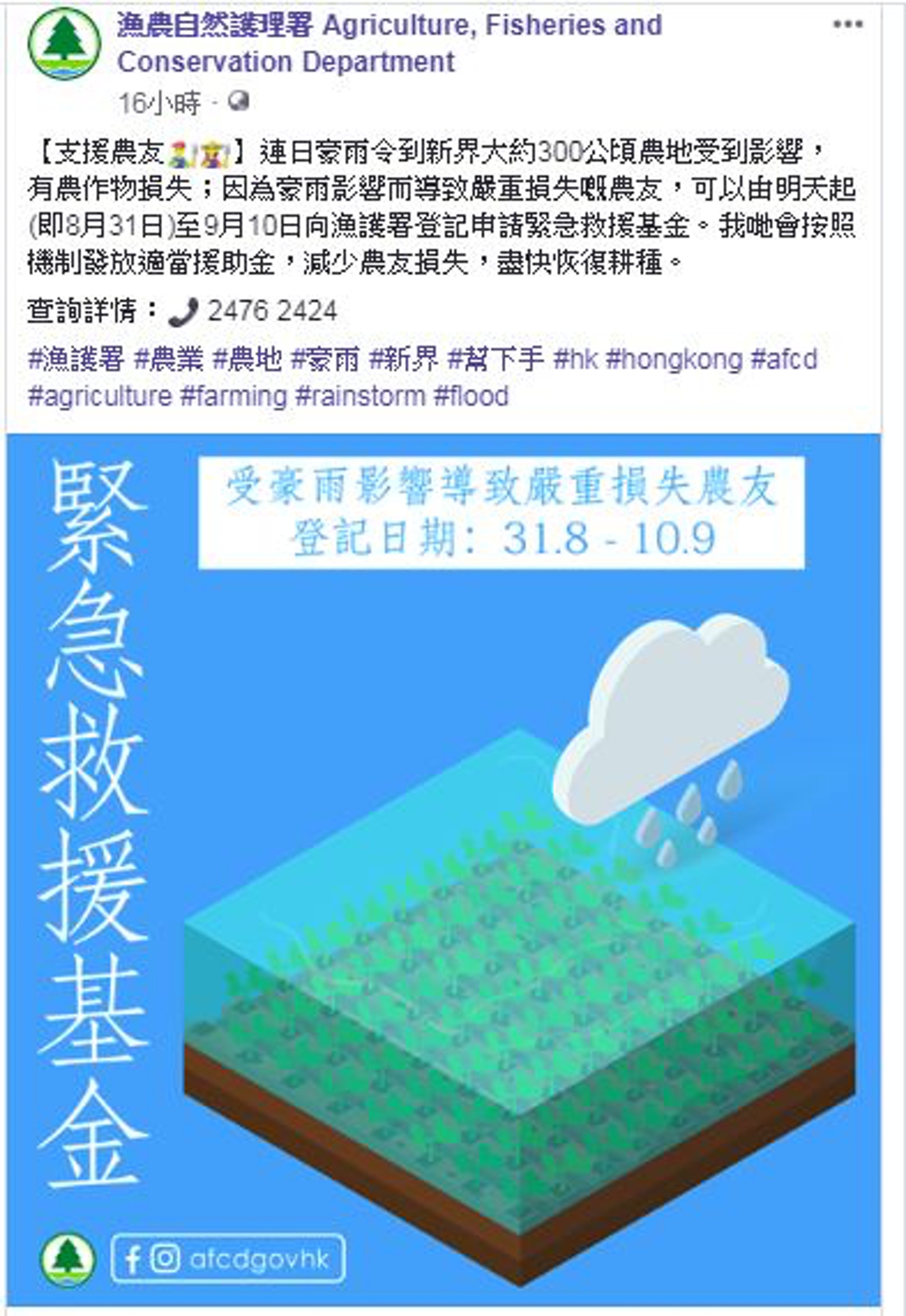 * U; e8 p5 b! z$ A, R; r+ a& G2 {www2.tvboxnow.com漁護署昨經網頁貼文稱,新界大約300公頃農地受到連日豪雨影響,農作物損失慘重。若因豪雨影響而導致嚴重損失的農友,可由今日起至9月10日向漁護署登記申請緊急救援基金,署方會按照機制發放適當援助金,減少農友損失,盡快恢復耕種。公仔箱論壇5 z* o( L' W5 s! m5 x1 v