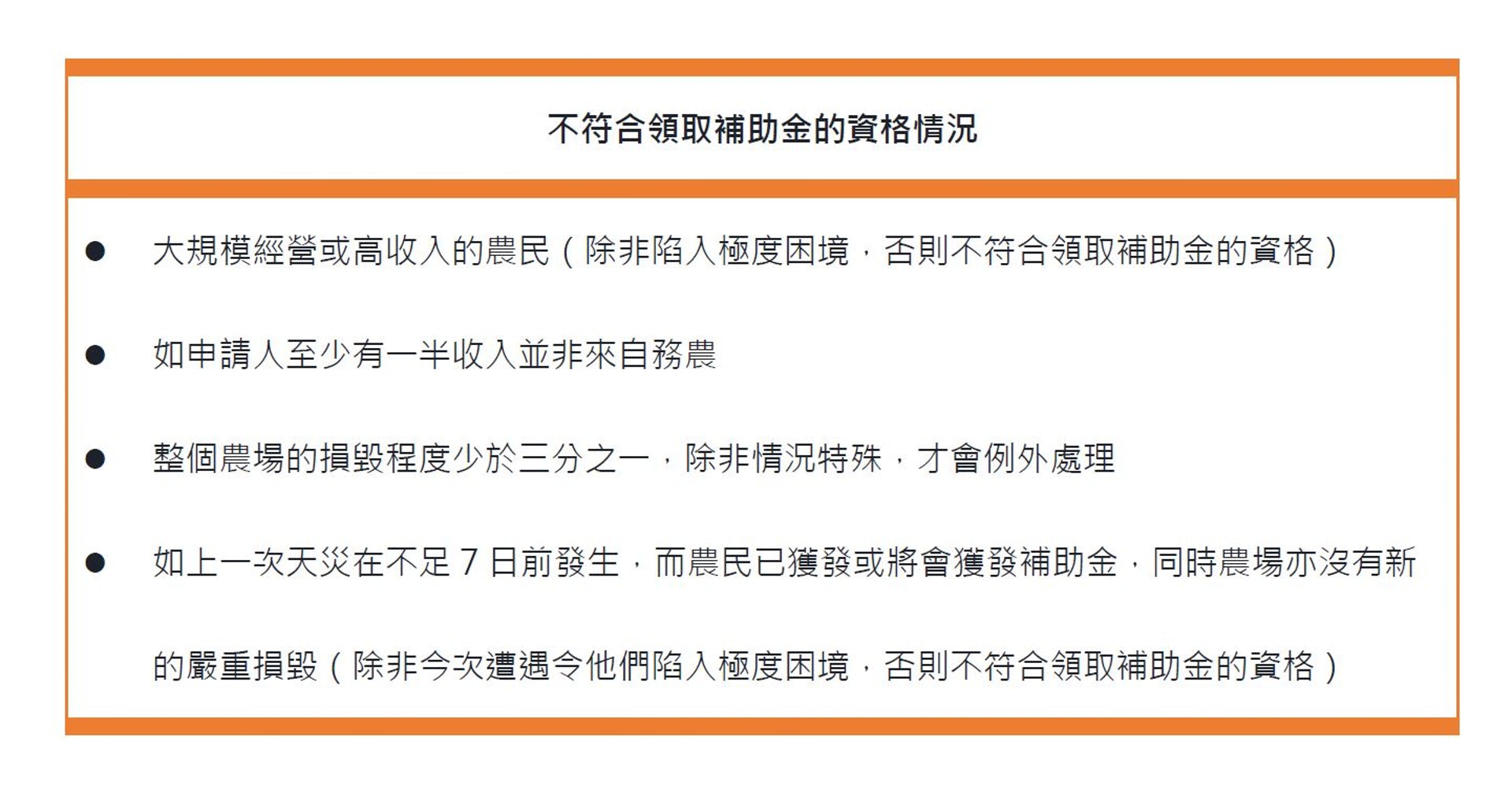 漁護署執行漁農業補助金有一定指引,通常只有「真正小本經營的全職農民」,才會獲得考慮。大規模經營或高收入的農民,除非陷入極度困境,否則不符合領取補助金的資格。如申請人至少有一半收入並非來自務農,或整個農場的損毀程度少於三分之一,便不會獲批申請。
