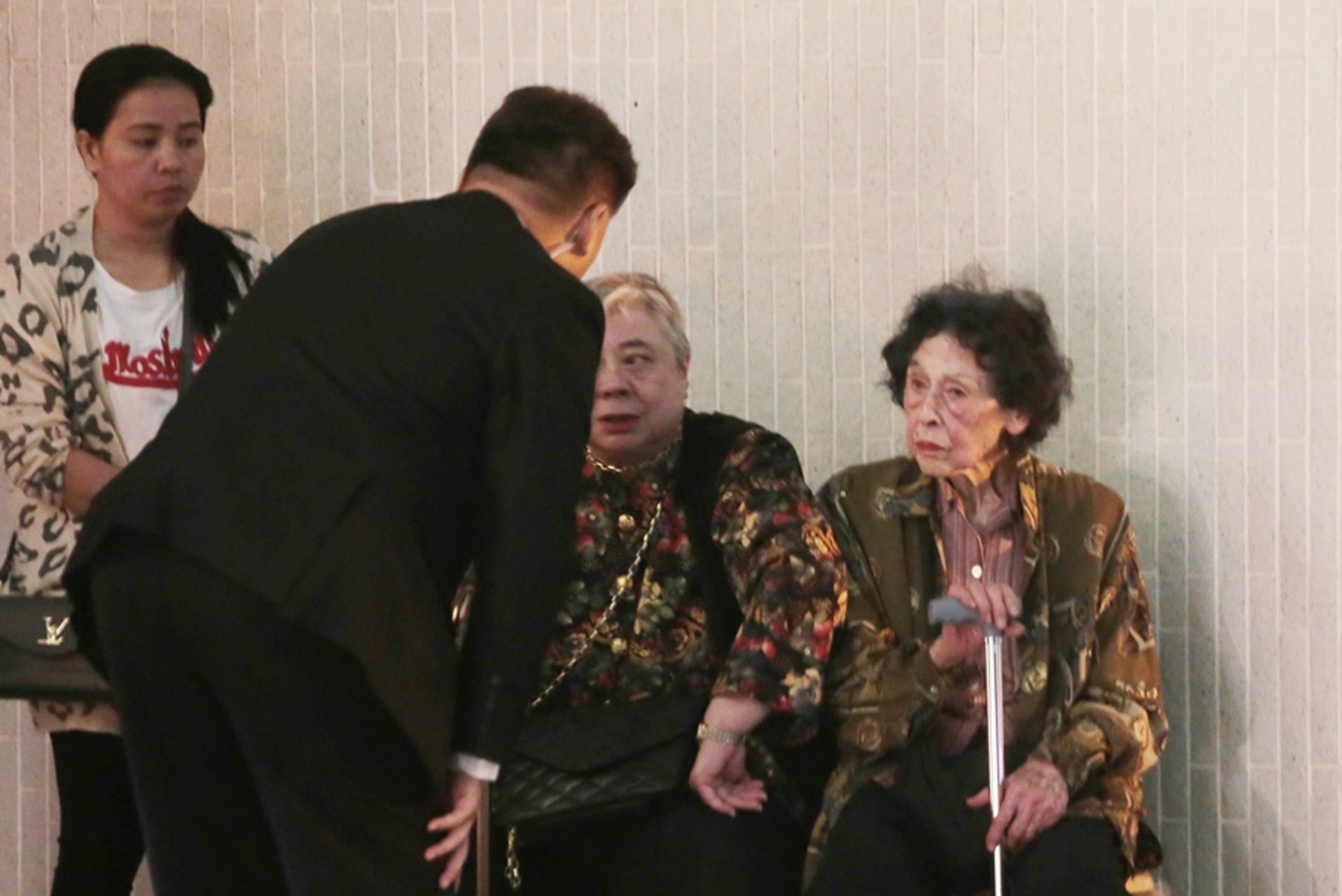 3 D1 {* @4 ~4 r: N, }- z' C公仔箱論壇梁冰濂(中)與其母親(右)及女傭(左),意外後坐在酒店外休息,保安員上前慰問。(余睿菁攝)