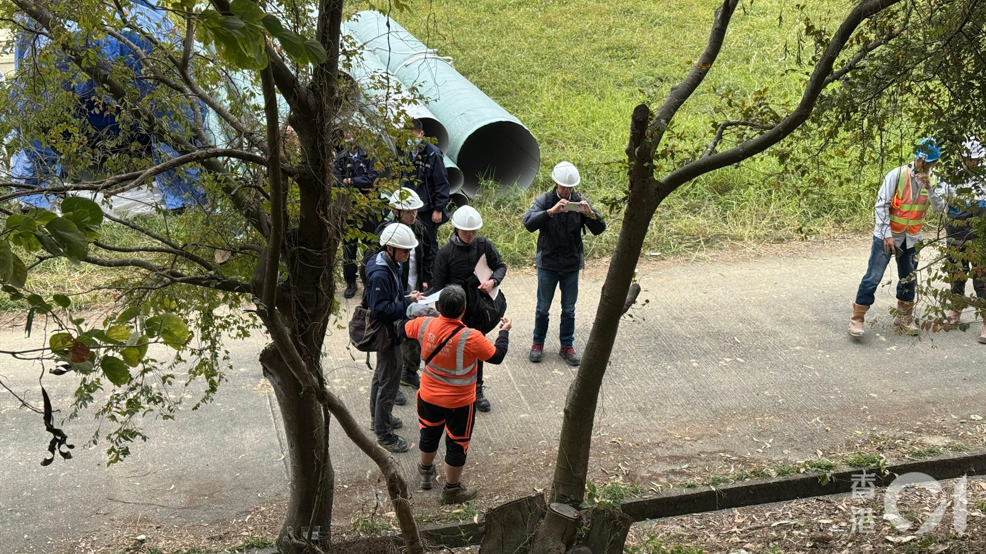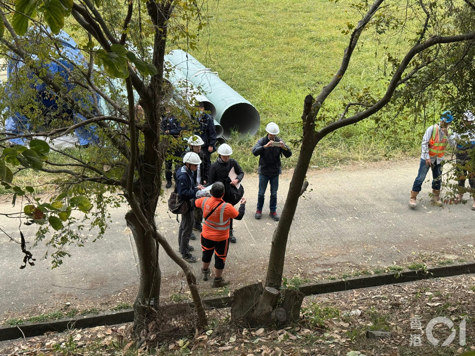 1 Q% { {; y! s( h: K7 C, I公仔箱論壇上水鄉蓄洪池工人被水管擊中斃命,相信是渠務署人員到場了解。(蔡正邦攝)