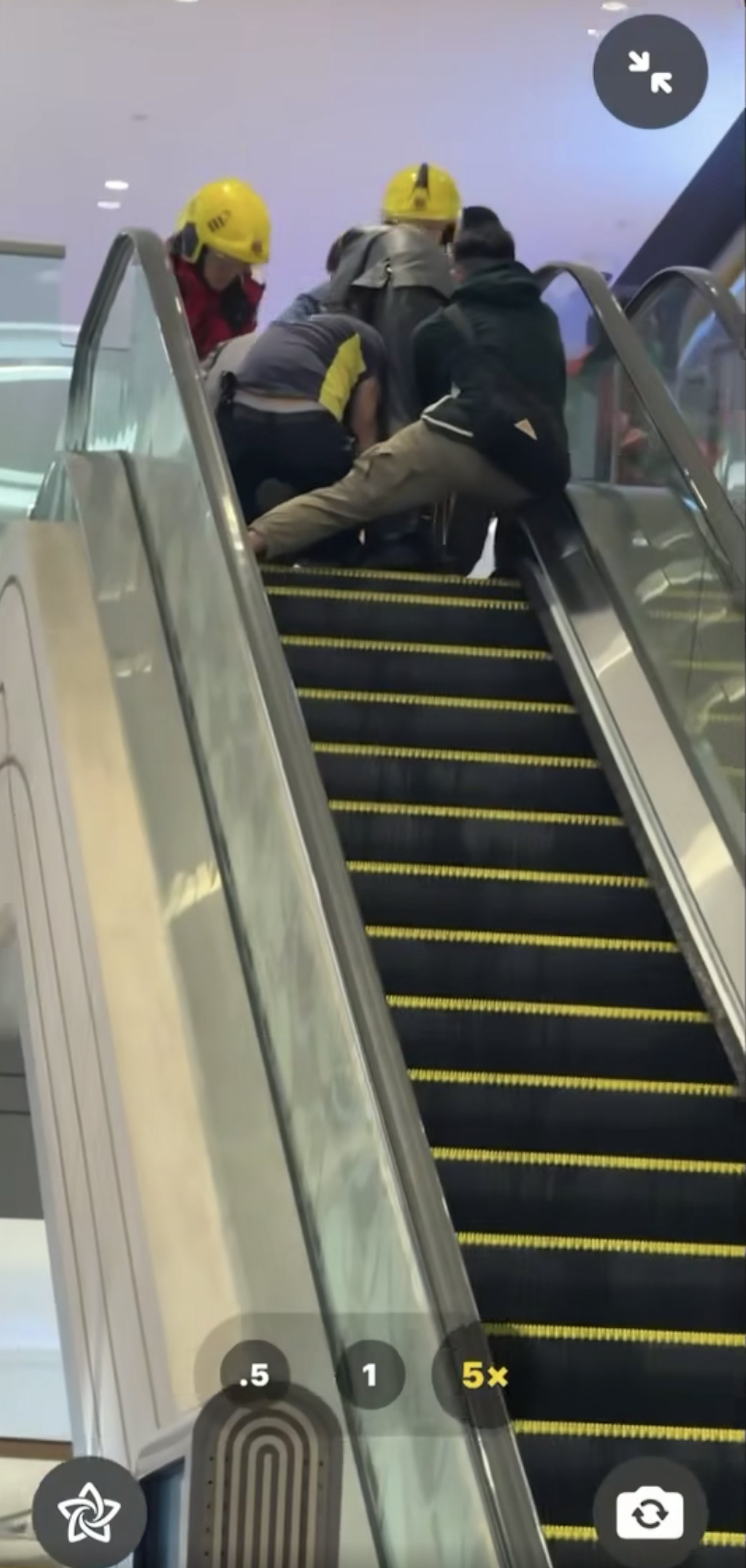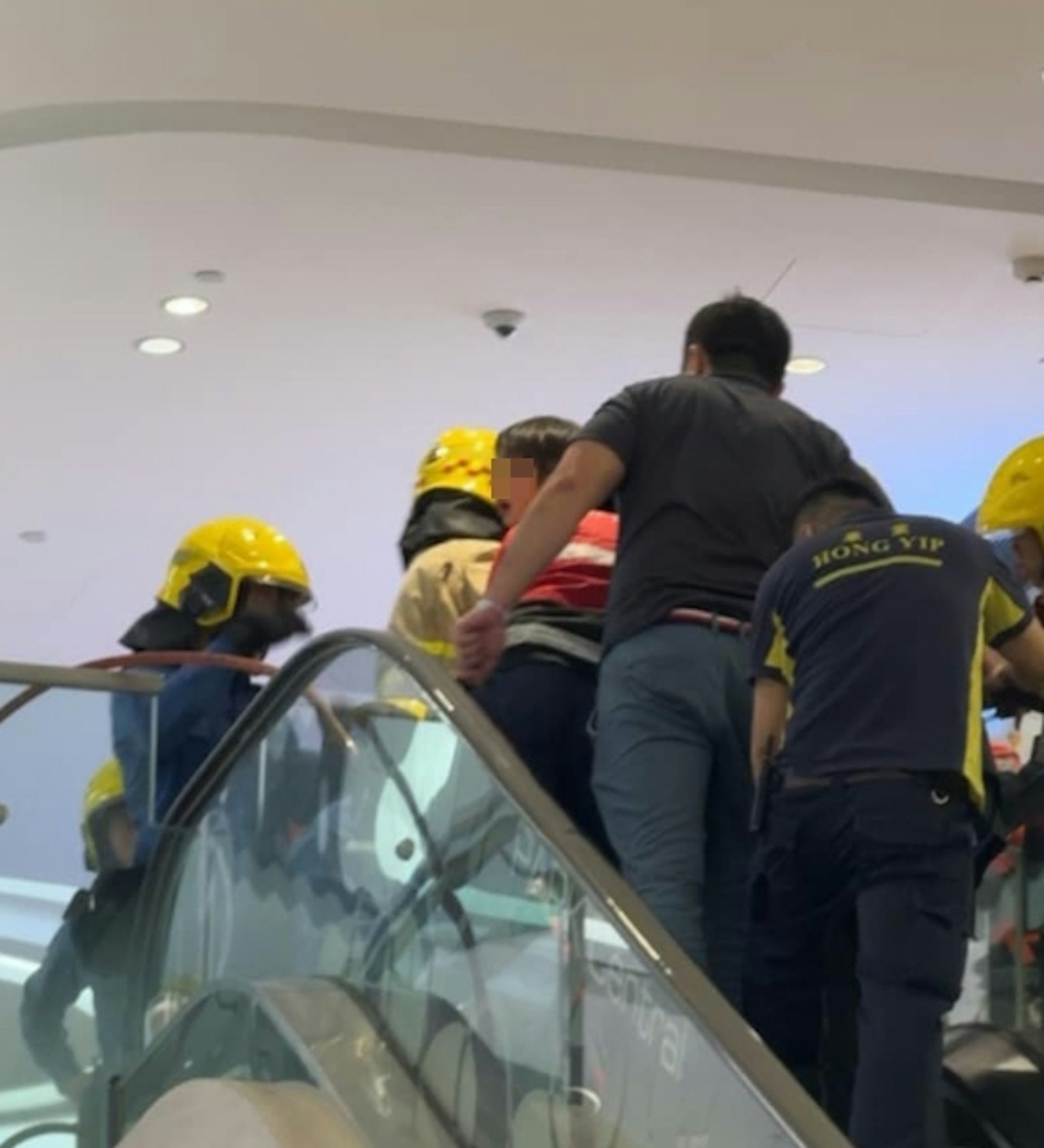 一名7歲的男童乘搭扶手電梯時,不慎腳部被縫隙夾實,一度被困。(Facebook 將軍澳主場 Tiger Zi Lau Fai)