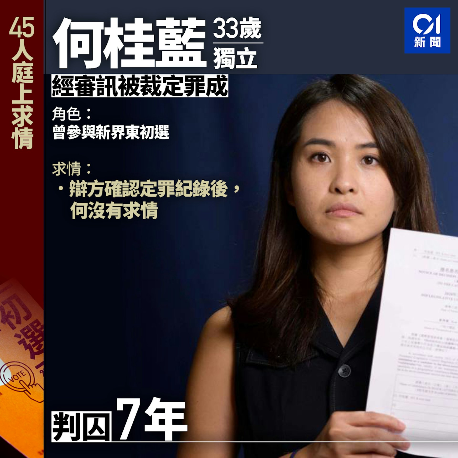 同屬抗爭派的被告何桂藍,判辭篇幅僅三段,法官指何被審訊後定罪,沒有求情,判她入獄7年。法官早前於裁決時指,何是其中一名最為激進的參選人,她想變更本港的現有政治制度,並反對「一國兩制」。