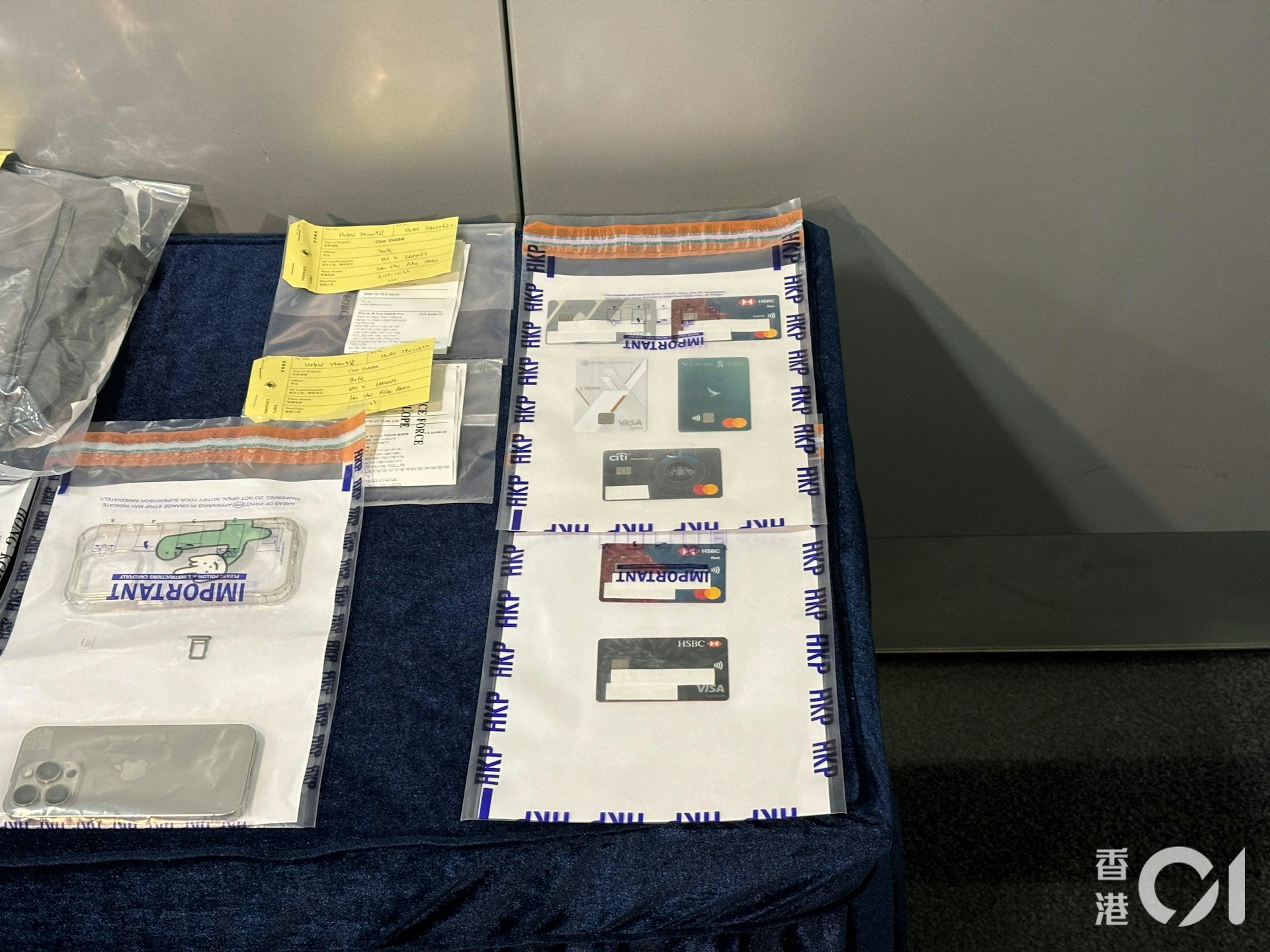警方起回疑犯犯案衣物,部份受害人被偷走的信用卡及購買單據。(陳浩然攝)