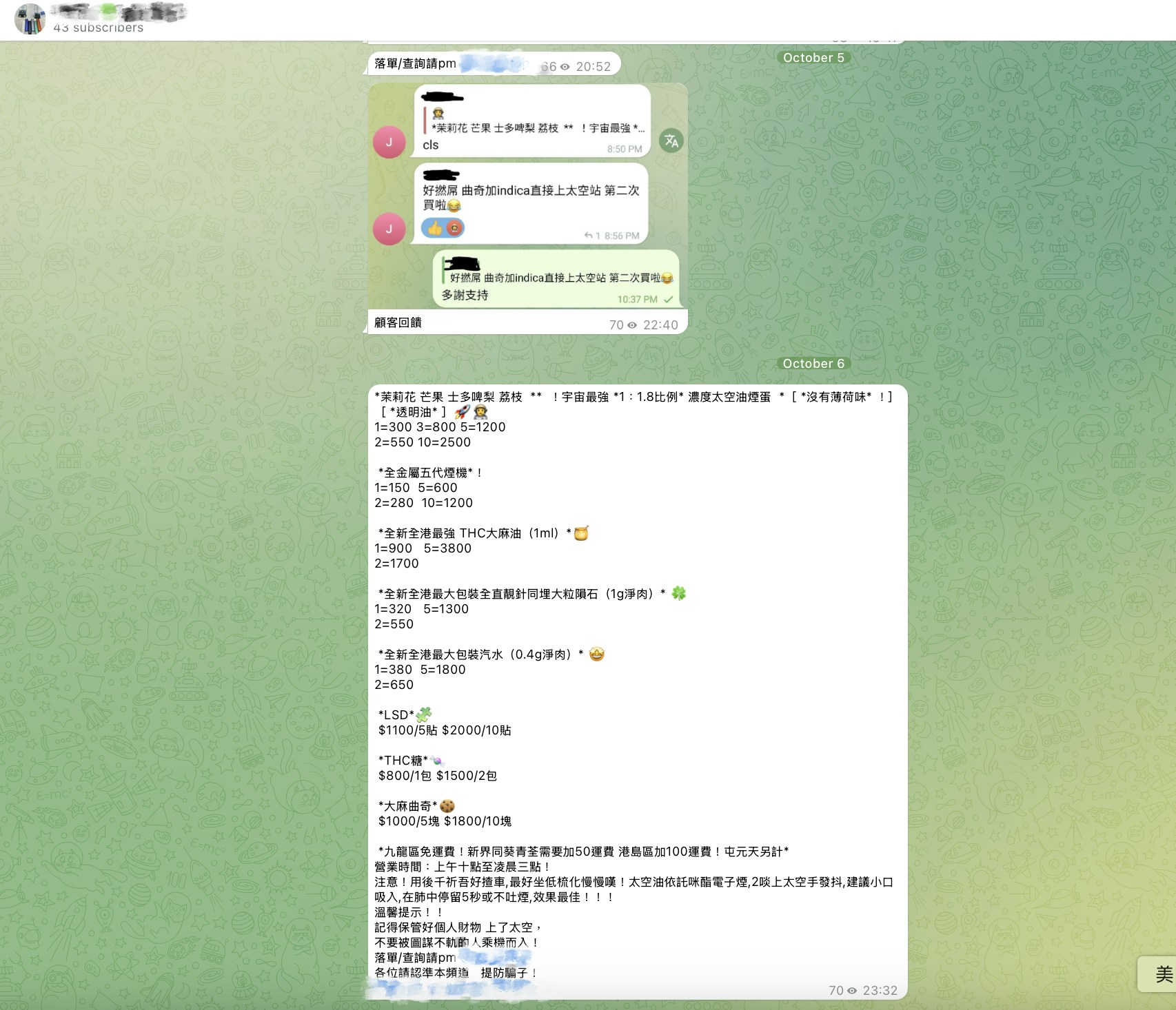 - F- {5 K/ N* g% ^) t他形容「太空油」抵食,因價錢上較傳統毒品便宜,現時市面上價格連運費為約$250、自取價則再便宜$50,且每粒煙彈可食一至兩小時。年青人可「friend搭friend」、經TG群組及Instagram等途徑購入「太空油」,故在校園內十分普及。他續指,「太空油」在校園內俗稱「油仔」,據他了解,有3成同學都有吸食的習慣,而他身邊10個朋友中有6至7個都有嘗試過「太空油」。他分享,因外型與電子煙相似,有朋友曾吸食後倒地,被警察截查,但只要謊稱是普通電子煙就「無事」。