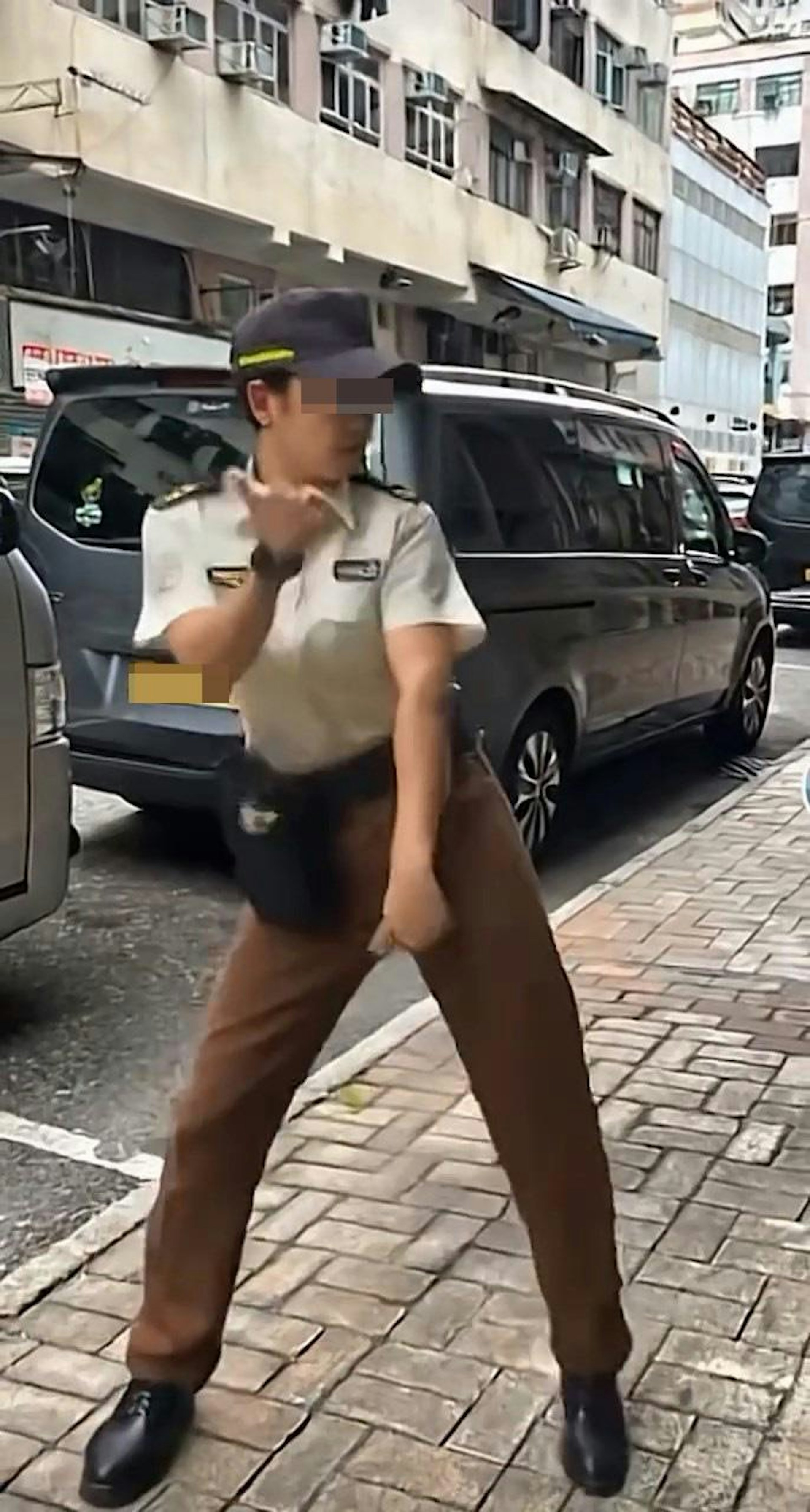 1名穿上疑似交通督導員制服的女子大動作跳舞,舉手扭臀左右搖動身姿,看似樂在其中。(網上影片截圖)( ~6 @& h8 k8 N& U4 @. E0 l5 \. w