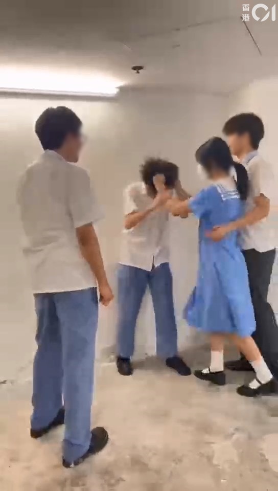 一名男學生被2男1女學生包圍,另有一名學生拍片。(讀者提供影片截圖)! ^" ]- A, E8 Q
