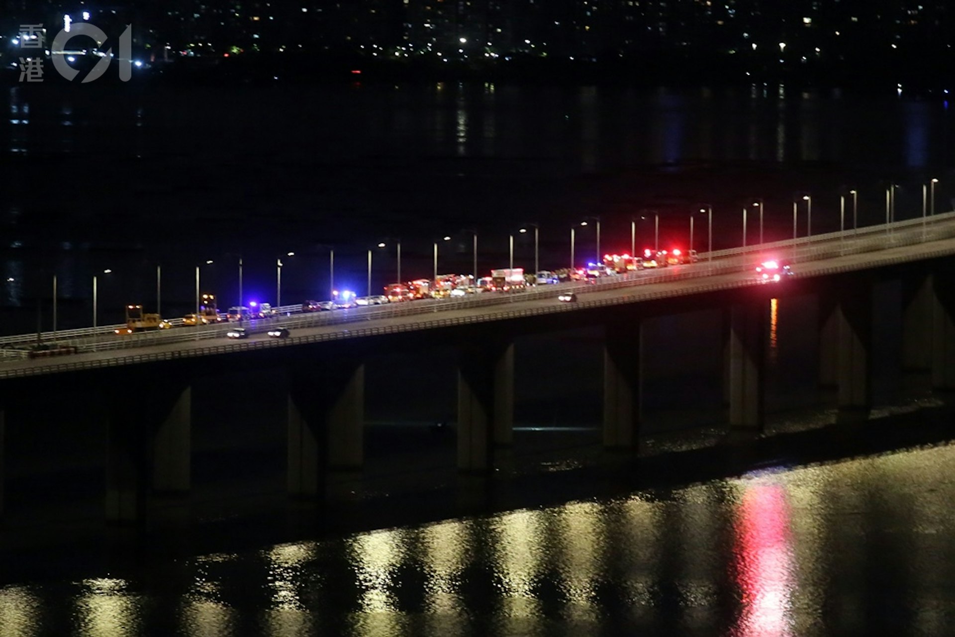 6 j& g; F% h& G! jwww2.tvboxnow.com深圳灣大橋橋面上有大批救援車輛。(李家傑攝)