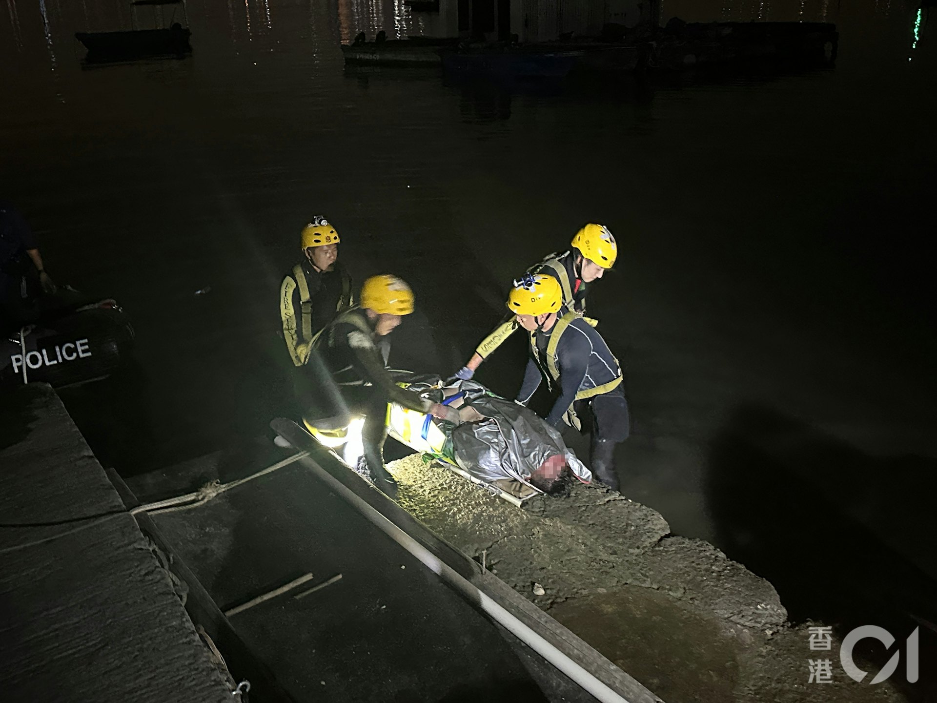 消防海務及潛水區,負責水底救援,派出兩隊潛水隊人員搜救,於晚上11時38分發現肇事車輛,傷者在司機位內,配戴安全帶,車身變型。至今日(3日)凌晨零時零分,潛水人員經天窗將其救出,經由水警快艇送往流浮山碼頭,再由救護車送院。消防指,當時水淺昏暗,水深僅2米,呈水退情況,能見度極低,救援有難度,救援過程期間,共使用了兩艘快艇及一架海上救援電單車。