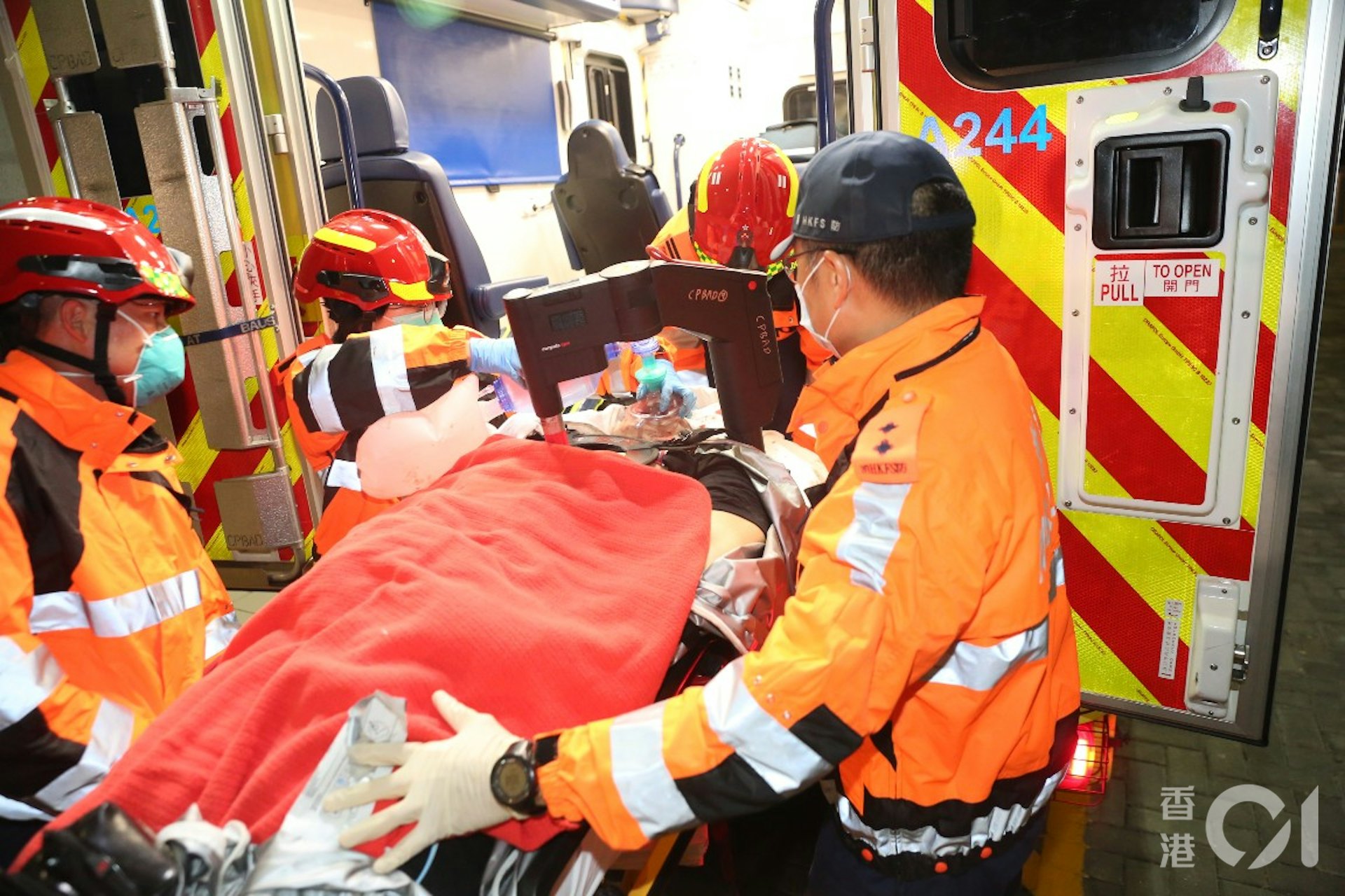 深圳灣大橋有車輛衝落海,被困者獲救送至流浮山碼頭,其頭部受傷流血,陷入昏迷,須進行心外壓急救。(王譯揚攝)