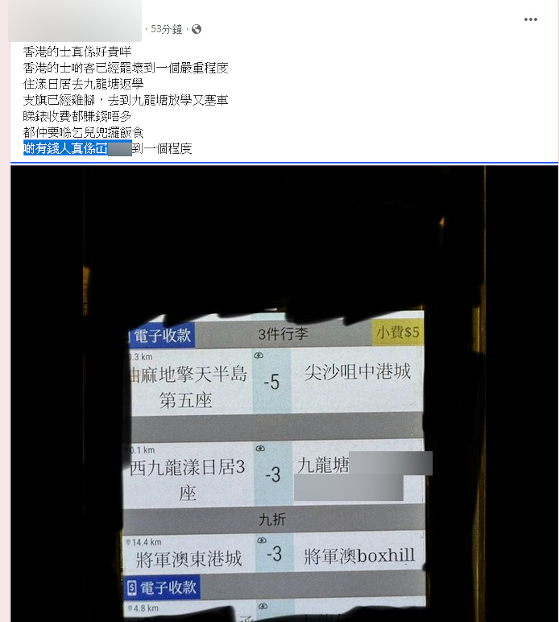 ; b6 o8 H4 R ]' N2 ~5 a# Atvb now,tvbnow,bttvb樓主怒斥:「睇錶收費都賺錢唔多,都仲要喺乞兒兜攞飯食,啲有錢人真係冚家X到一個程度。」(fb群組「的士司機資訊網Taxi」截圖)1 W) \/ k: ~7 G1 m7 A6 H% A( _" X