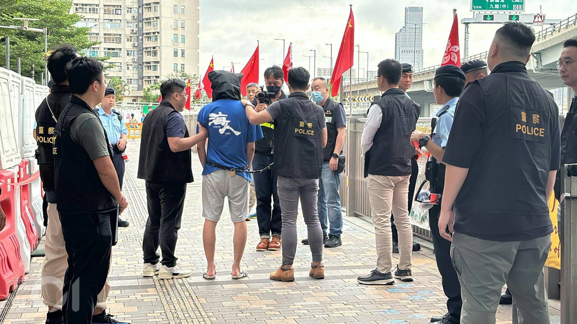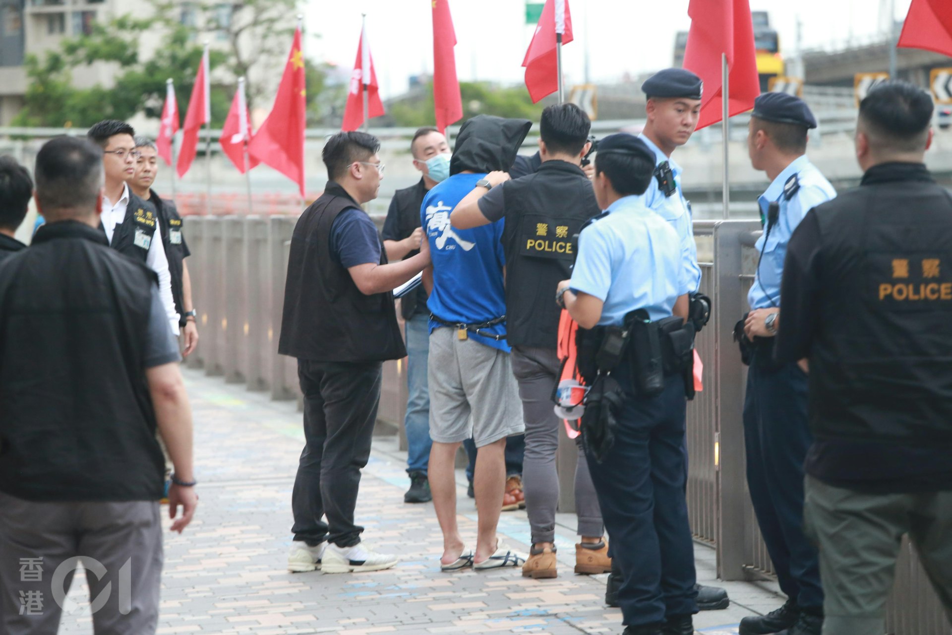 疑犯由探員押解至北角碼頭進行案件重組。(陳浩然攝)