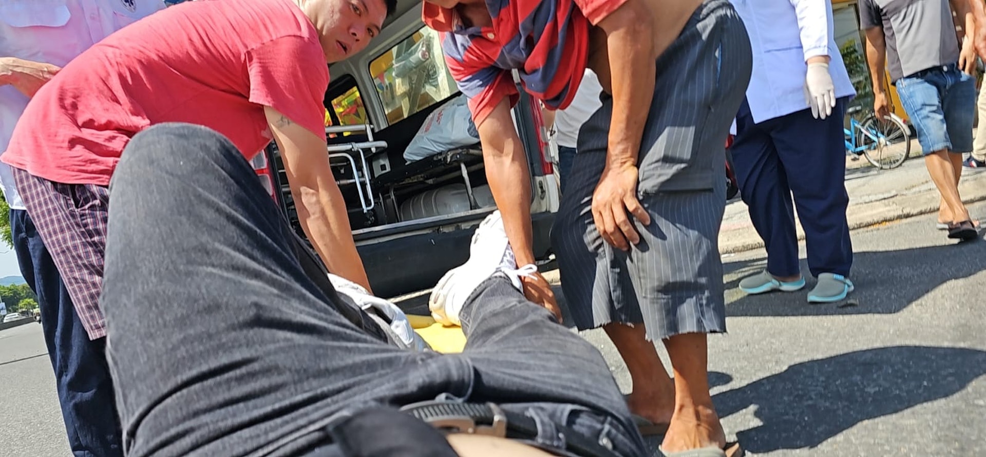 - f( A% k- c6 a/ Utvb now,tvbnow,bttvb事主葉先生受傷倒地,一名好心途人代為召救護車將他送院,圖為事主在事故下拍下被人送上救護車的情況。(事主提供)