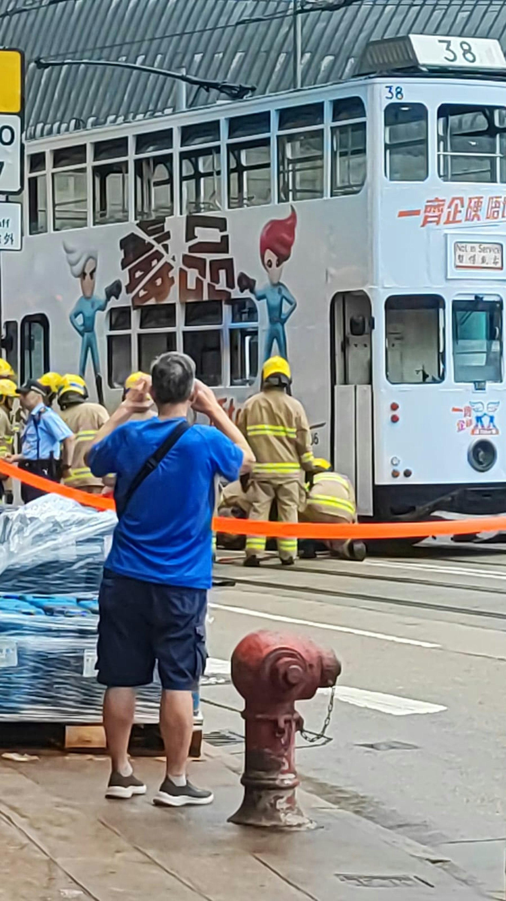 現場消息稱,男傷者等一行4人,在游泳池對開的德輔道西過馬路,當時正落雨。電車沿路東行,其間撞倒男傷者和兩女童。其中男傷者被困在電車的左邊車底,有途人為他撐傘擋雨。大批消防員接報趕至拯救,先後將他們救出。