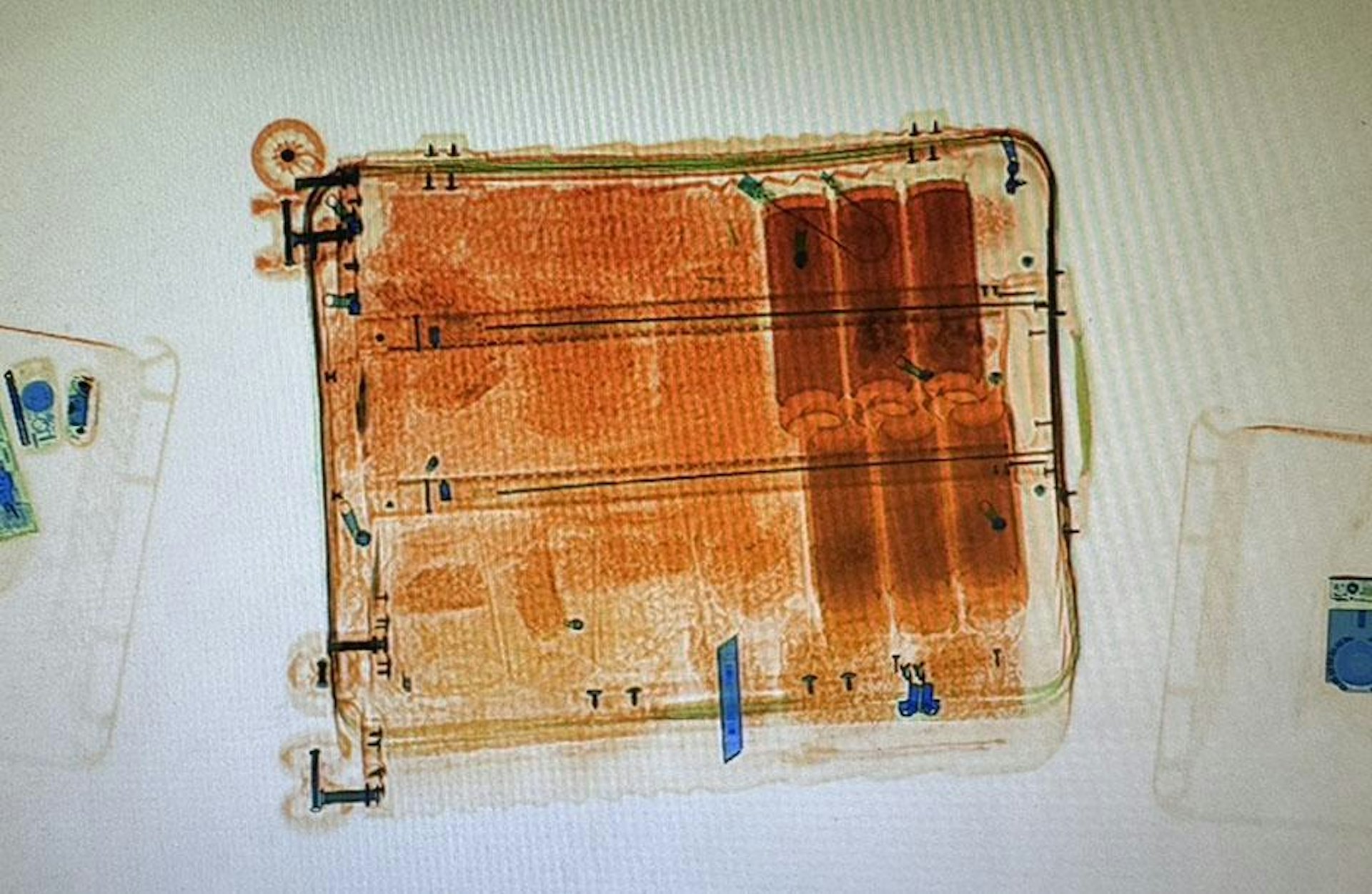; A$ F- C& r# h3 B公仔箱論壇泰國執法部門展示在X光檢查站,掃瞄涉案四名港青的一個帶輪手提行李箱,發現篋內零食盒藏了40塊海洛英磚。(泰國毒品管制局辦公室圖片)