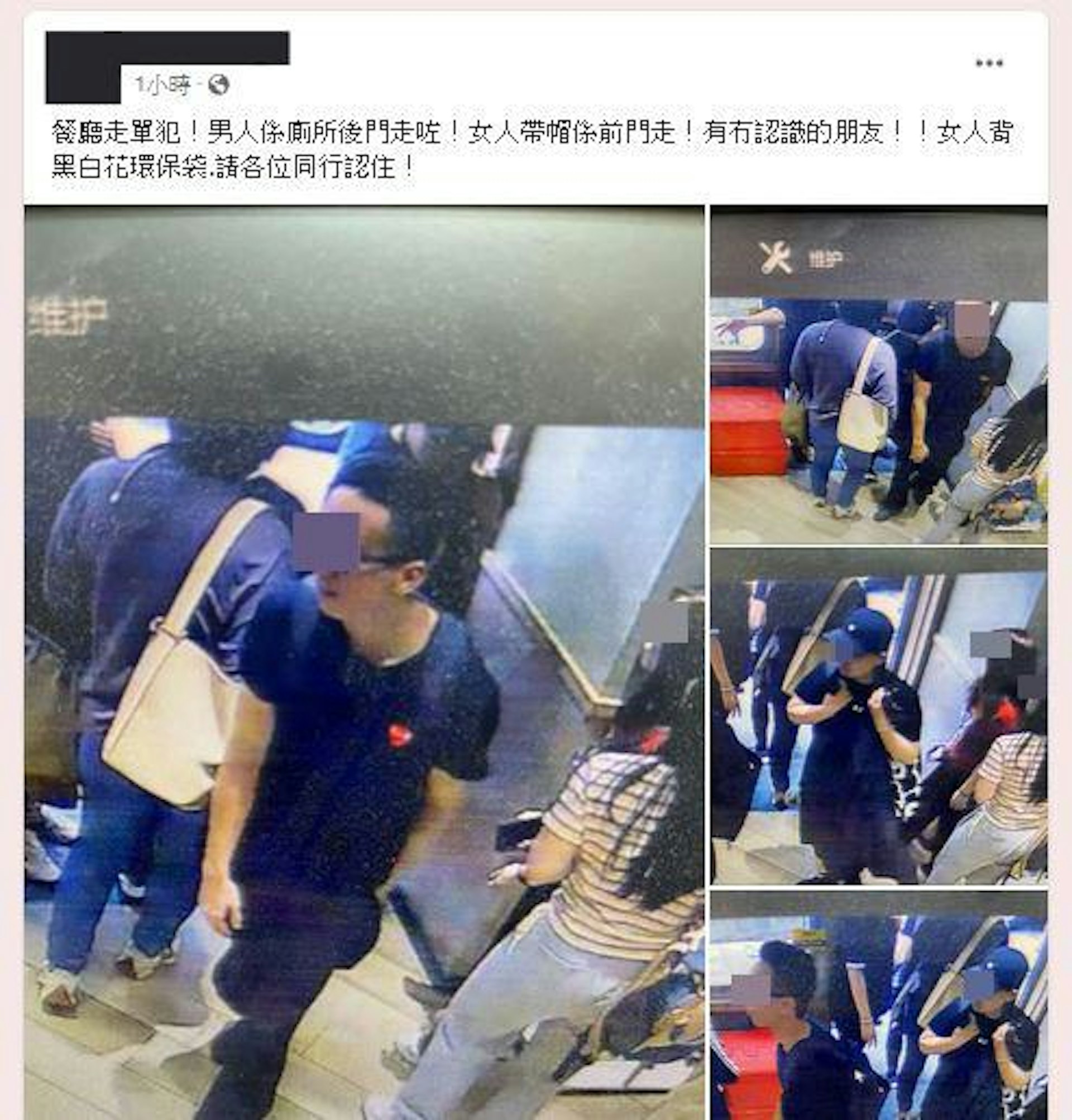 有尖沙嘴餐廳職員於Facebook群組「香港茶餐廳及美食關注組」發布多張閉路電視畫面截圖,留言「餐廳走單犯!男人喺廁所後門走咗!女人戴帽喺前門走!有冇認識的朋友!女人背黑白花環保袋」,又提醒「各位同行認住」。公仔箱論壇5 r Q# M& U/ _) g. q9 ~8 p