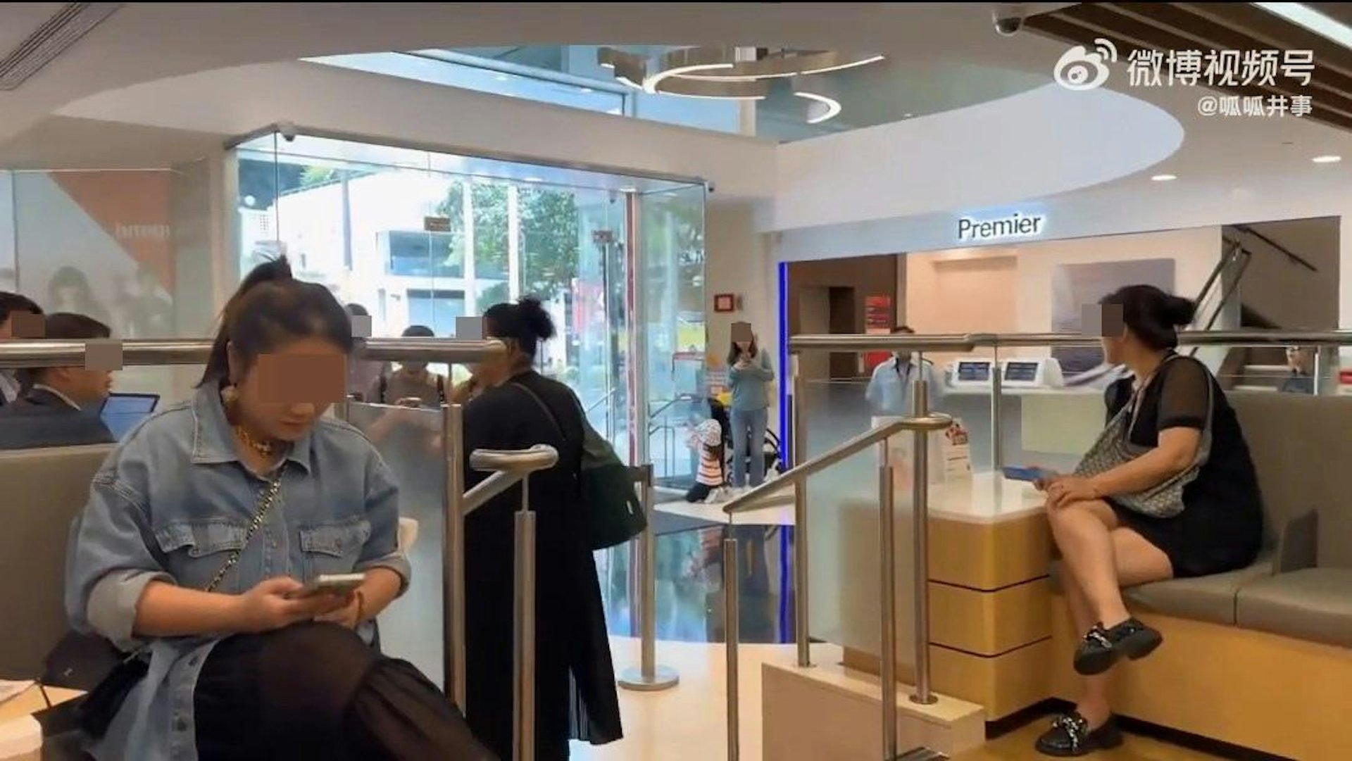 % ]- b7 q- k( m7 B) t# o# J內地微博周一(5月6日)起瘋傳1段「內地大媽大鬧香港匯豐銀行」影片,指有內地婦人不滿說普通話被區別對待,咆哮怒罵職員。(微博影片截圖)