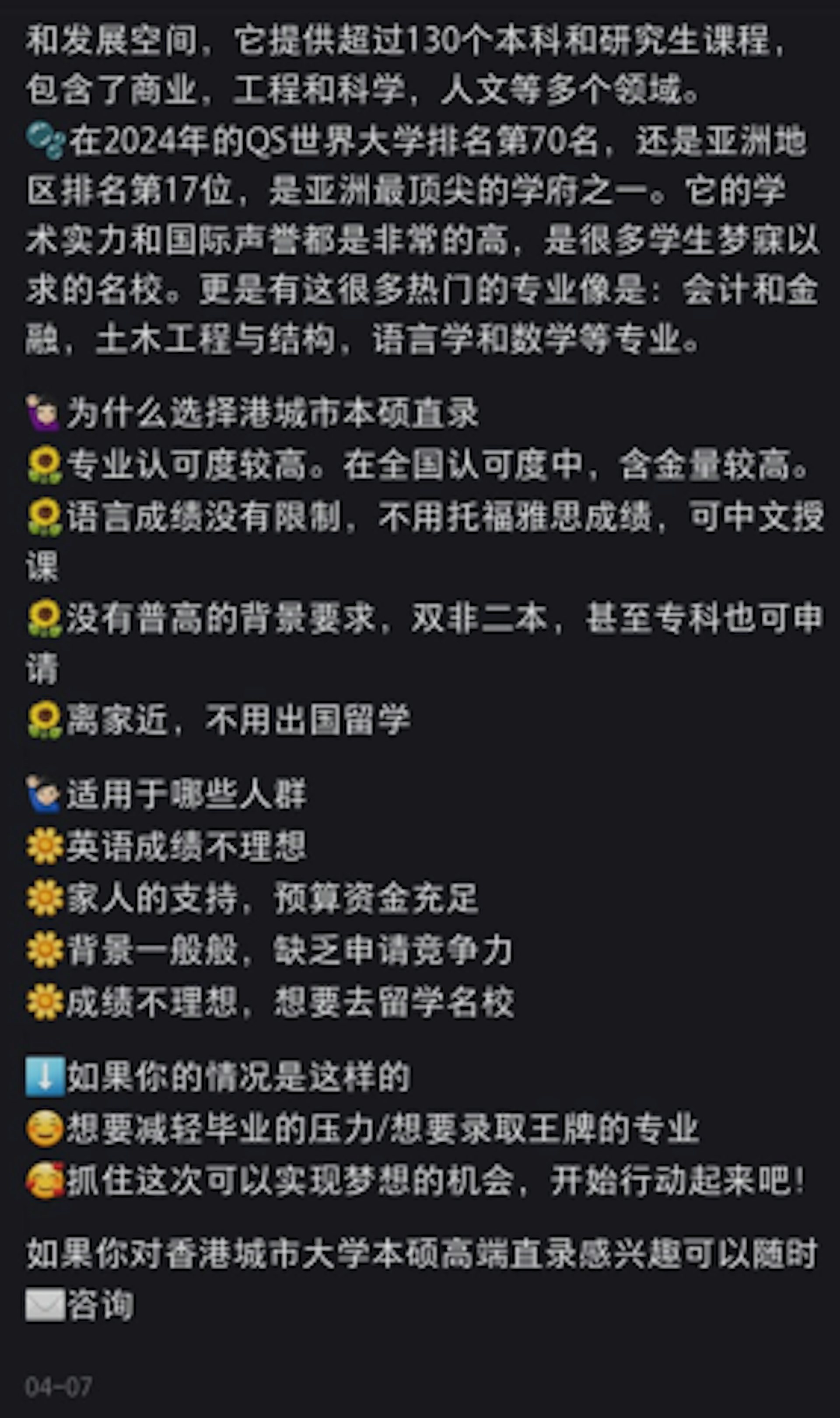s7 _* n( @ A1 B9 i. Wtvb now,tvbnow,bttvb內地社交媒體上,有不少留學中介聲稱可以提供香港的大學直接錄取服務。(小紅書截圖)