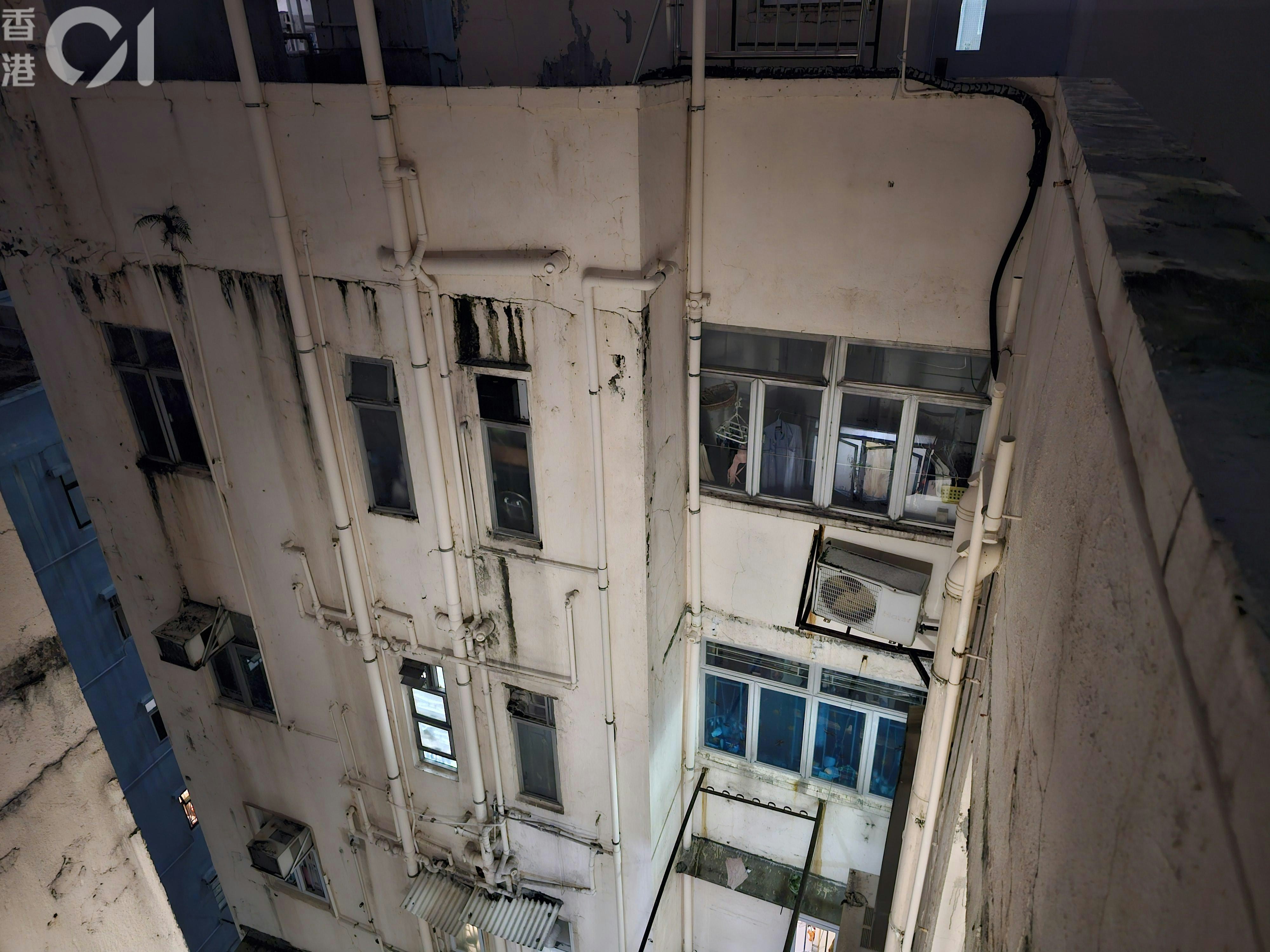 楊男今早離家發現忘記帶八達通及鎖匙,在家門前呼叫家人無果後,懷疑欲由天台爬回家中,不慎失足墮下天井,送院搶救後惜告不治。(梁偉權攝)