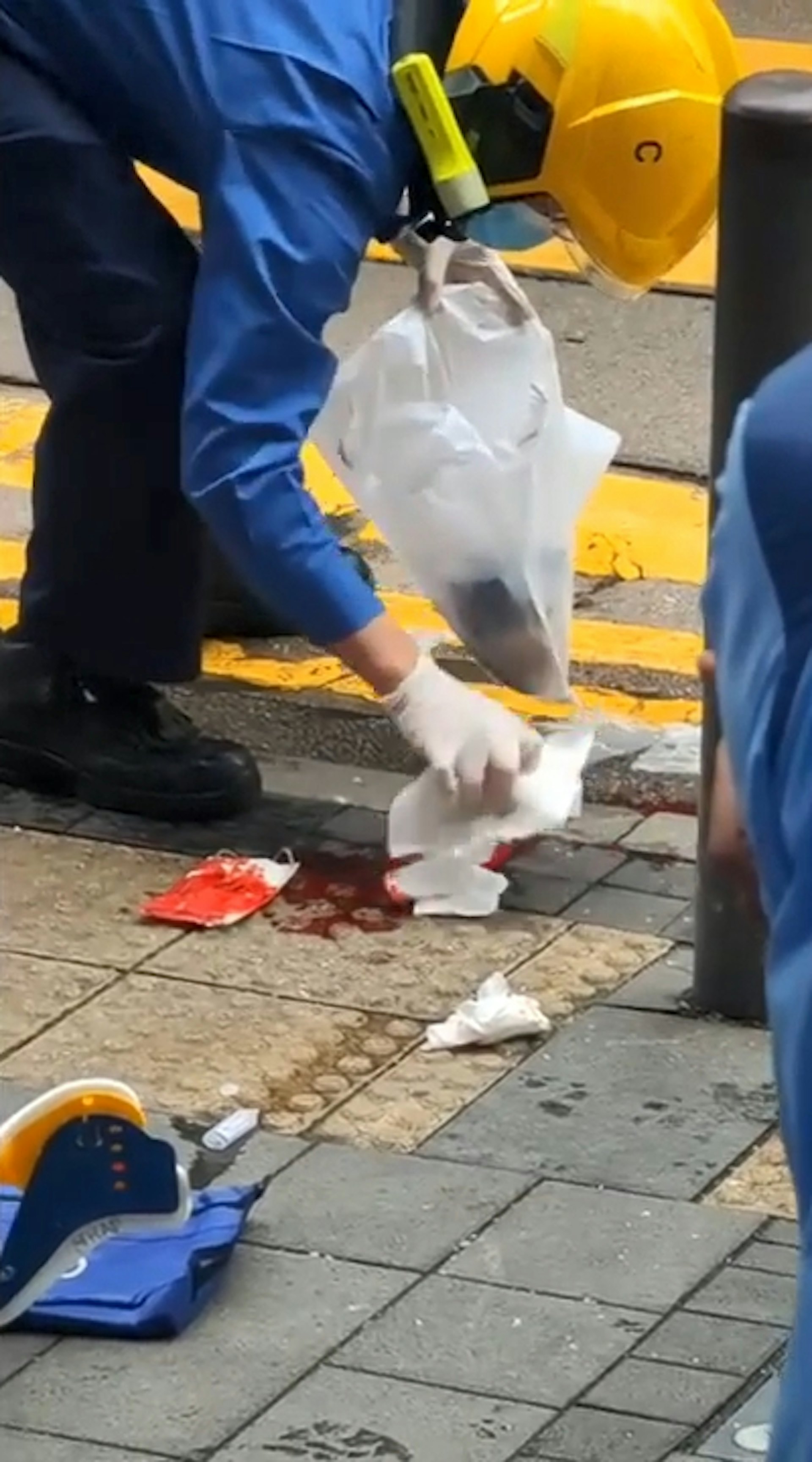 2 }2 M8 s( f, W# Fwww2.tvboxnow.com一名女子在中環德輔道中與畢打街交界遭巴士撞到,救護員及消防員即場為她急救後,有消防員清理遺下的急救用品。現場地面遺下血迹及染血口罩(小紅書/雙月灣日落收藏家陳先生提供片段截圖)