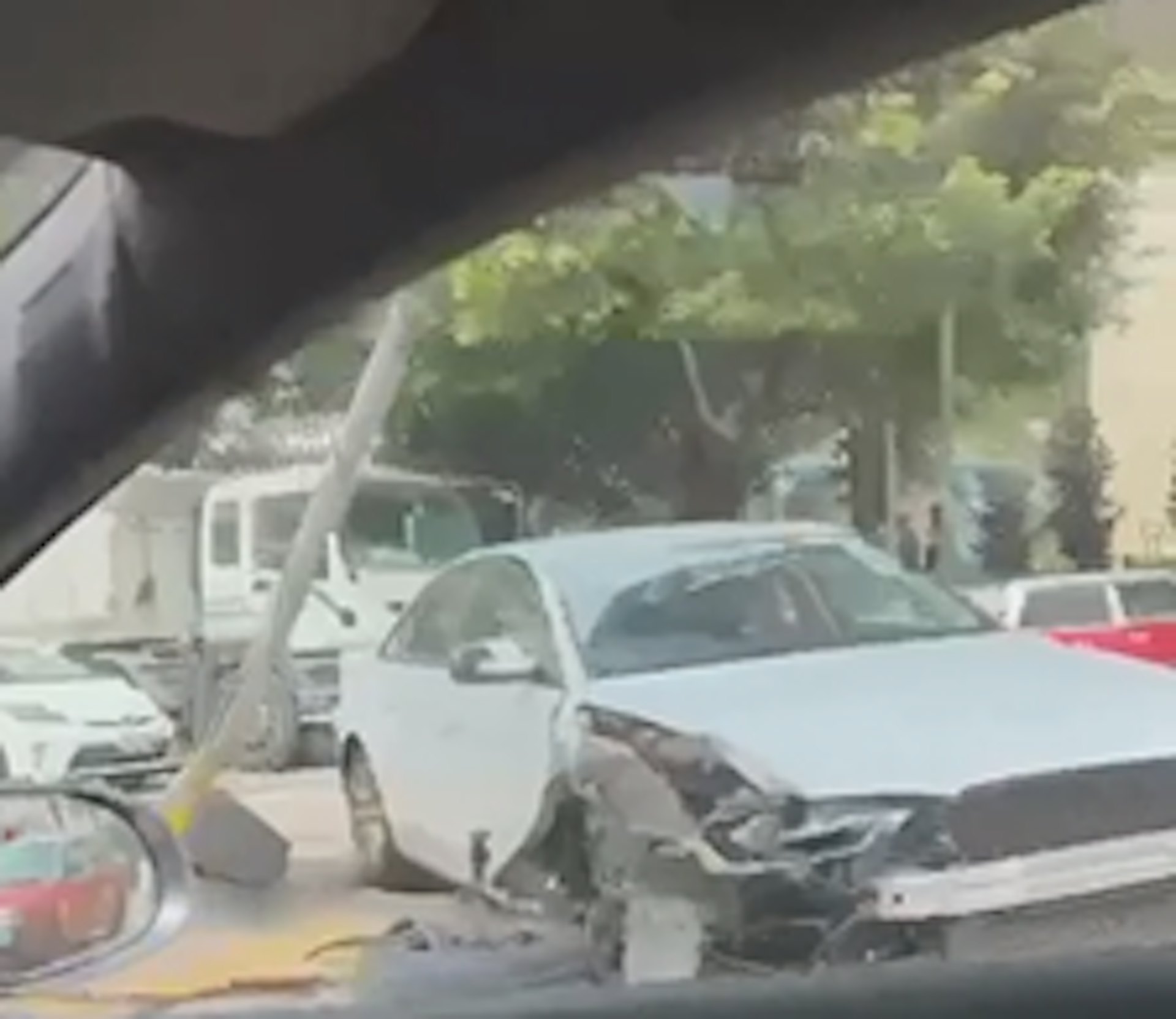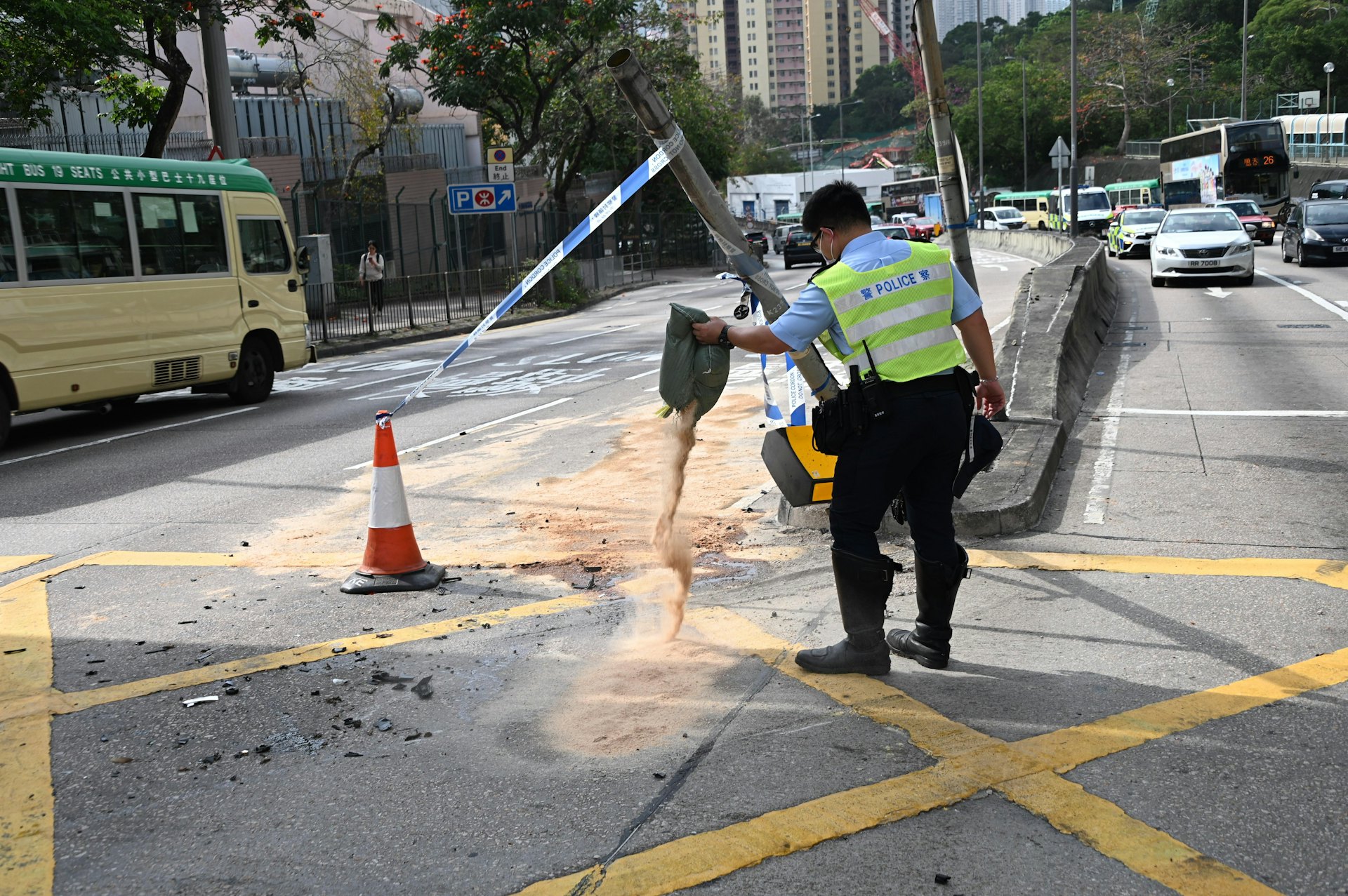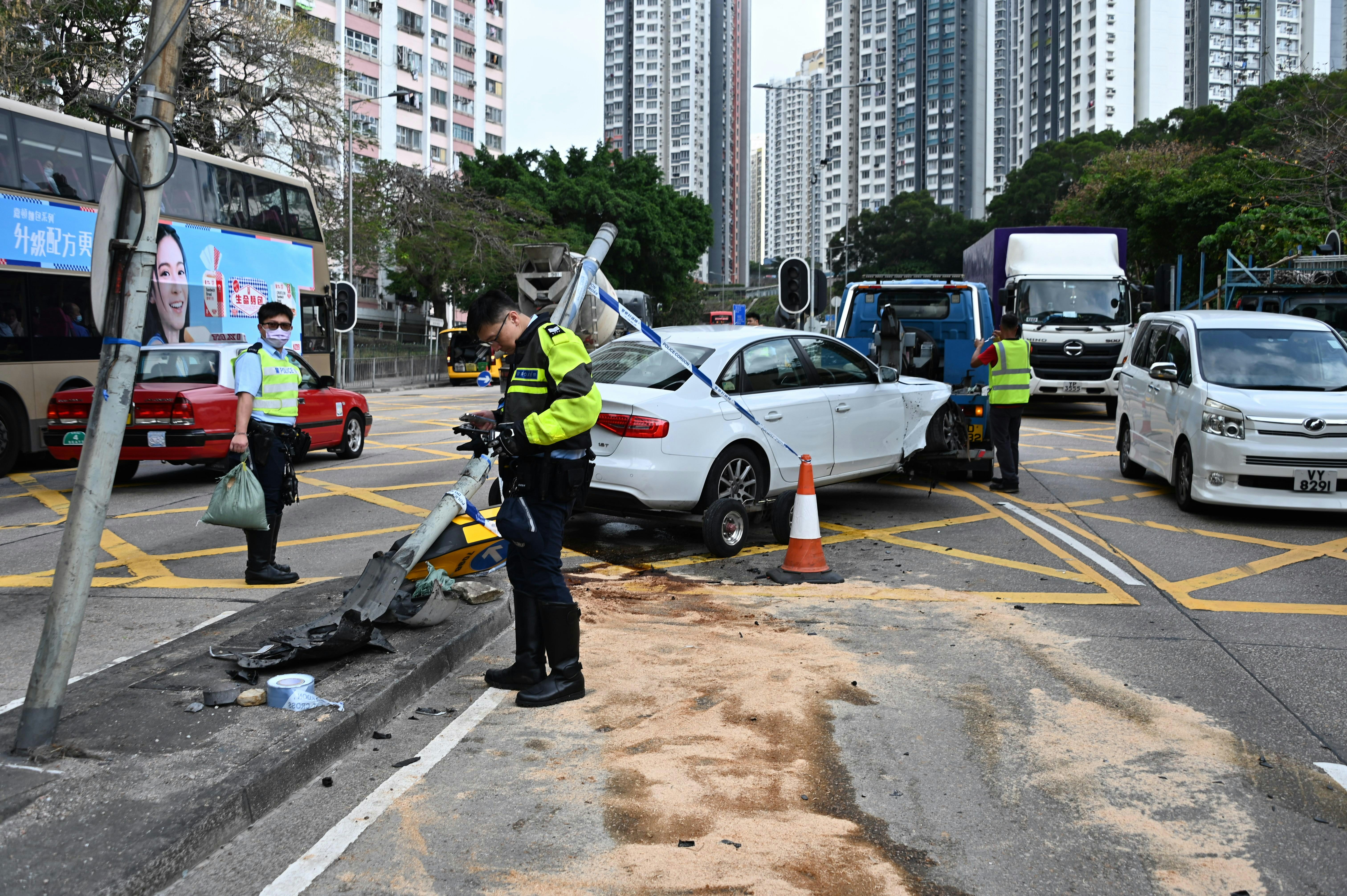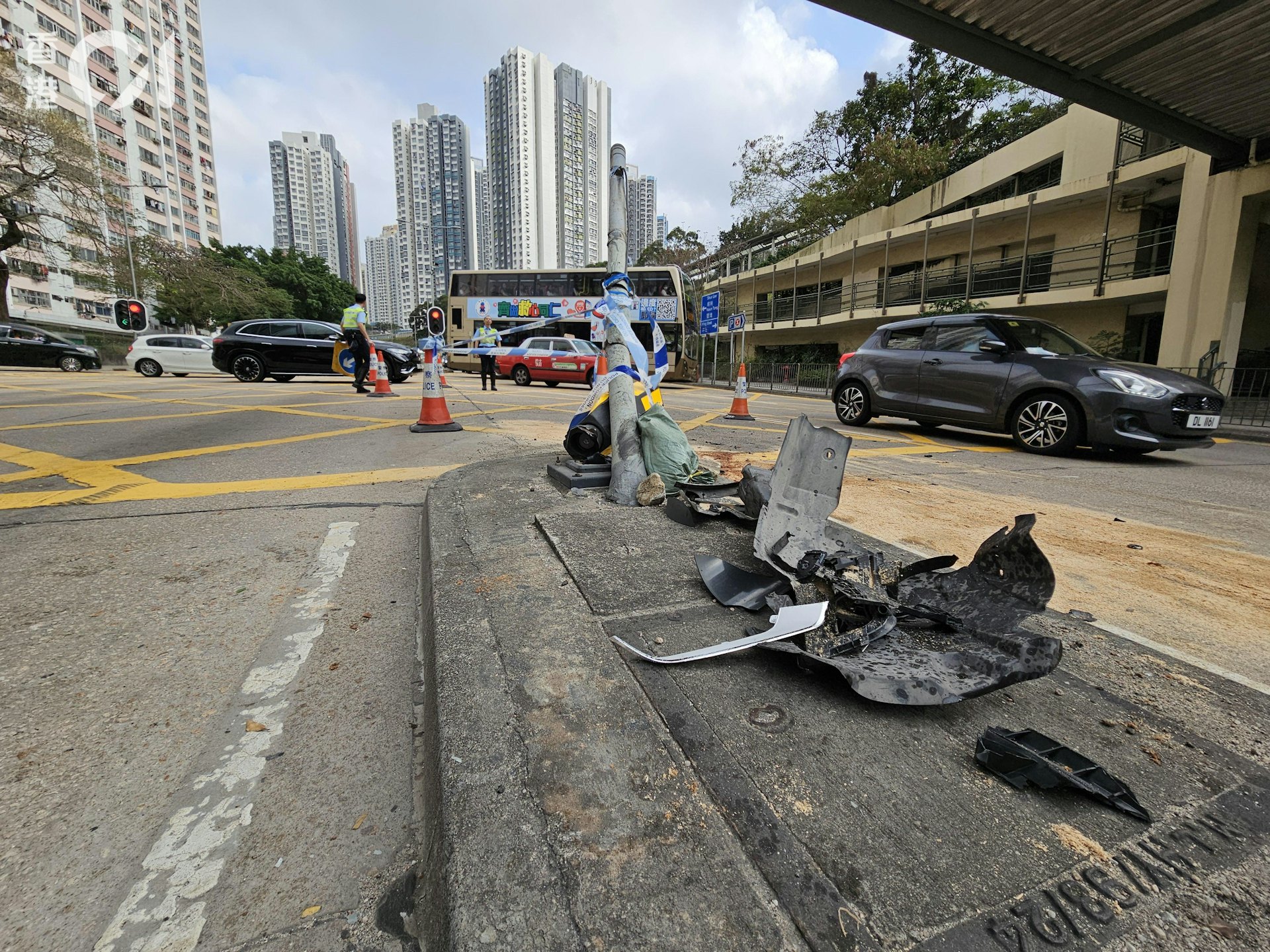 一輛Audi私家車在清水灣道近牛池灣街市對開上斜位置懷疑失控「自炒」,撞毀兩支交通燈及一個交通標誌牌。(Angel Yu/馬路的事-即時交通資訊台)