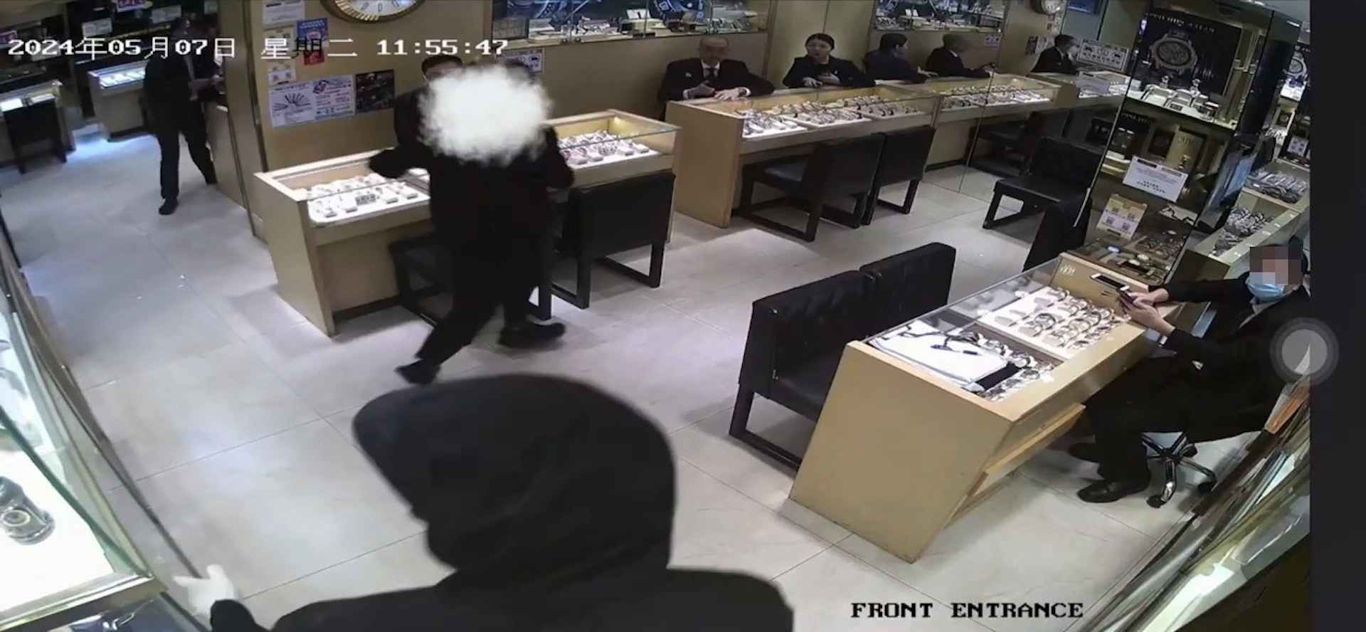 片段顯示,5名蒙面匪徒乘一輛白色私家車,在名人站外海防道馬路落車,分持刀和鎚入店,數名途人見狀即急步避開;店外亦一名女職員疑受驚輕拍胸口,並懷疑拿起對講機通知。店內一名站近門口的男職員驚見劫匪闖入,立即逃向店內,部分職員亦馬上站起,當中有人欲上前走近劫匪,惟隨即遭對方指嚇。
