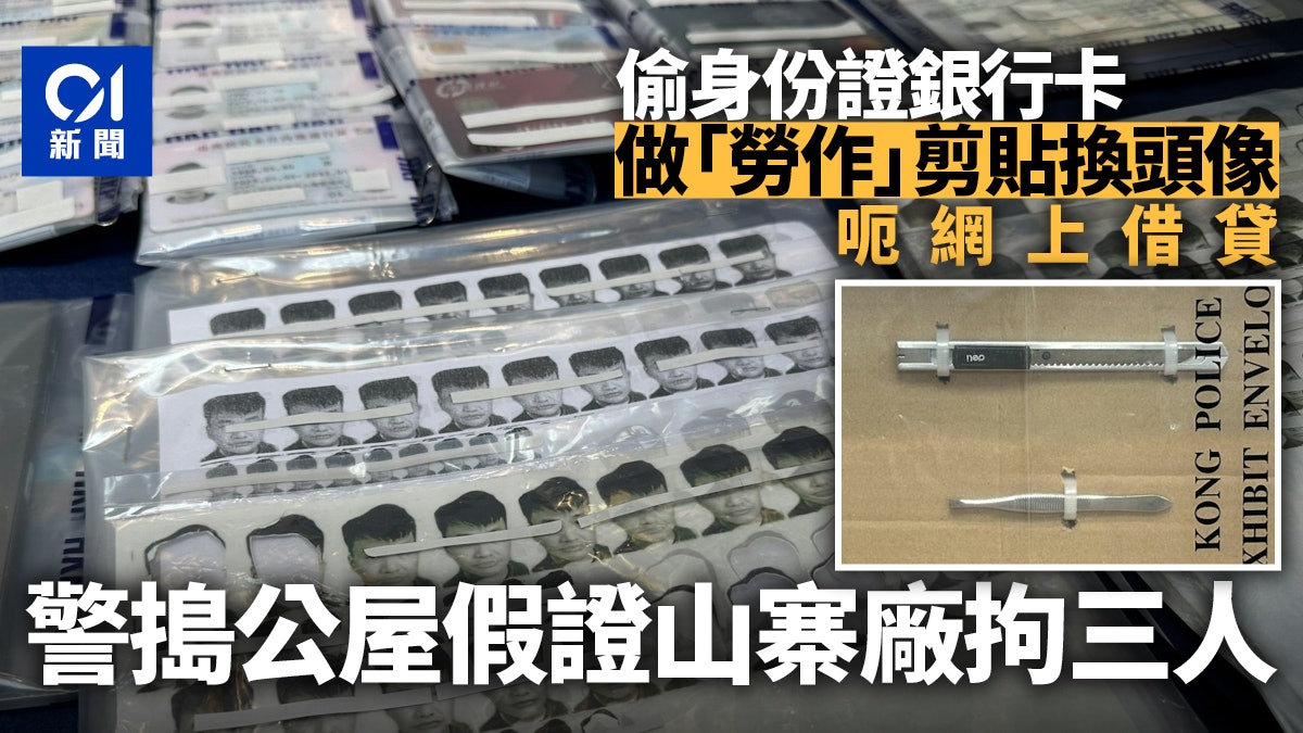 警方早前接獲線報,指有犯罪團伙涉嫌盜取他人身份證明文件,然後以剪貼方式轉換頭像,利用他人的資料行騙,將偽造文件上傳至銀行的網上開戶系統,申請貸款。人員昨日採取行動,突擊搜查長沙灣海麗邨一單位,檢獲28張屬於他人的身份證明文件及銀行卡、一批製作工具、以及多張印有不同尺寸證件相頭像的貼紙,相信用作轉換身份證頭像。警方形容該批偽造文件的手工「劣質」,而且製作工具簡陋。行動中,3名本地男女涉嫌「偽造文書」及「盜竊」被捕,警方仍在調查騙徒有否成功申請貸款。