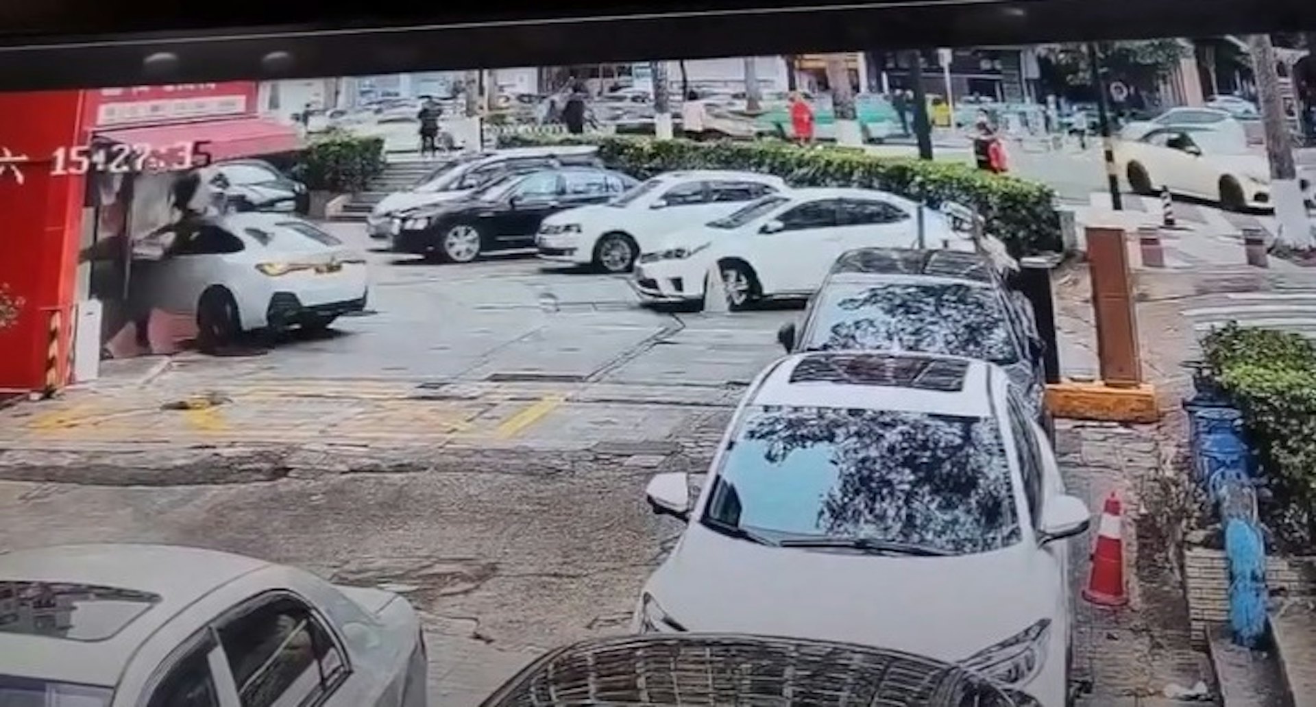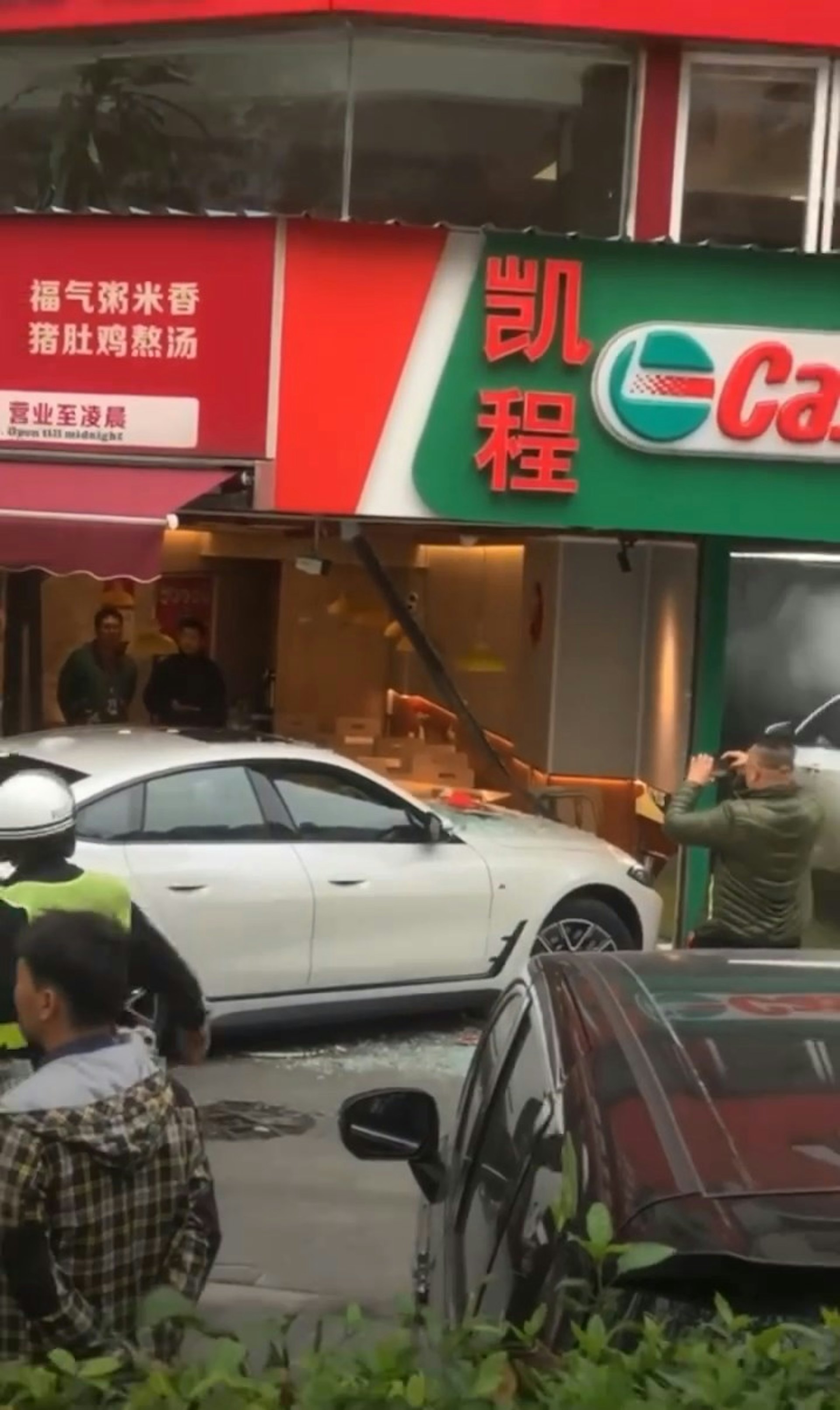 肇事寶馬轉入閘口後,高速直插粥舖。(網上影片截圖)2 ~1 K" H$ I$ i2 R- K% }9 C
