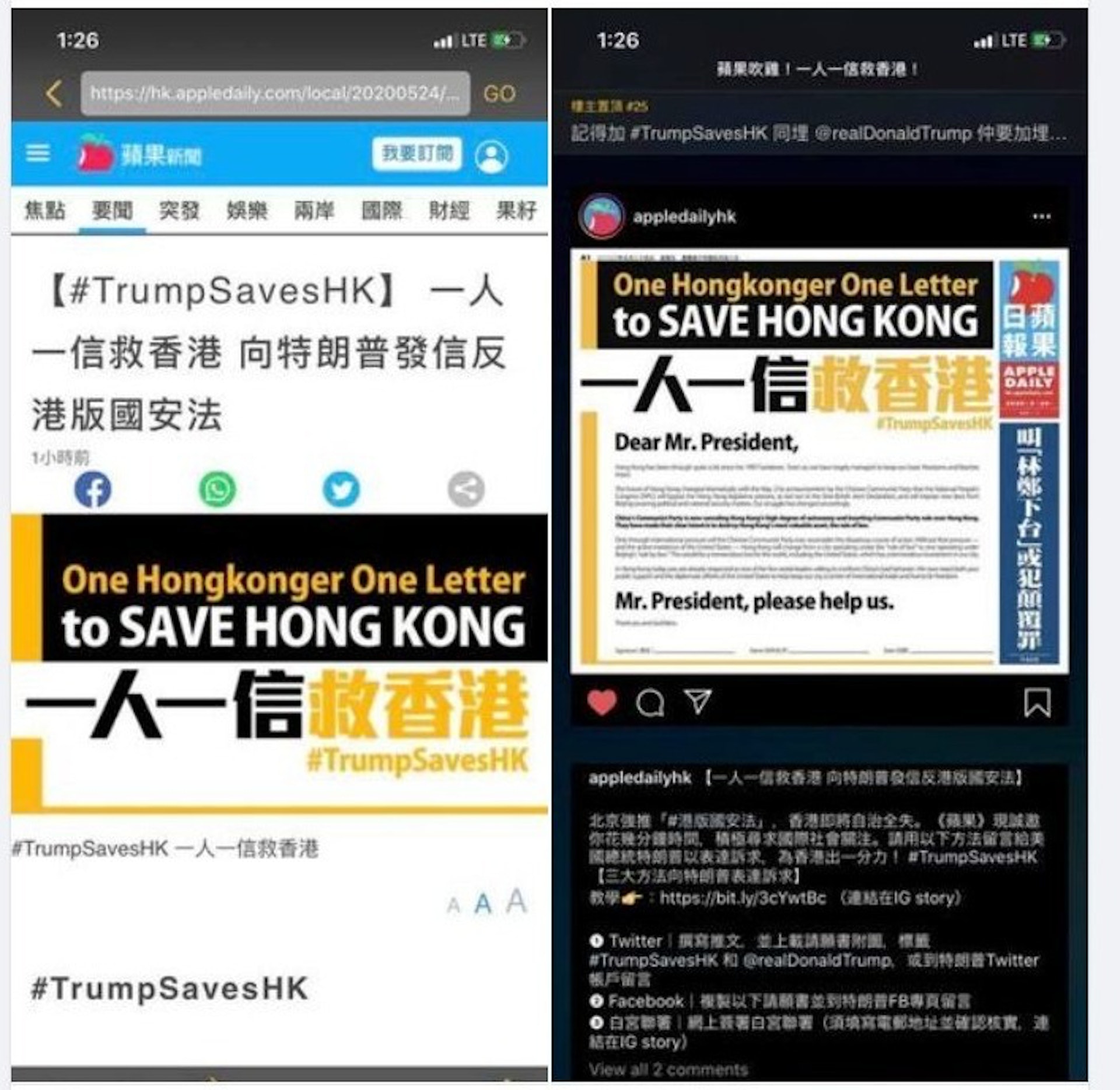 5 R Y# F8 R4 J% U5 n# E2020年5月,蘋果日報發起一人一信救香港。(網上圖片)www2.tvboxnow.com$ I# e' C- Z% j$ V8 T/ K s