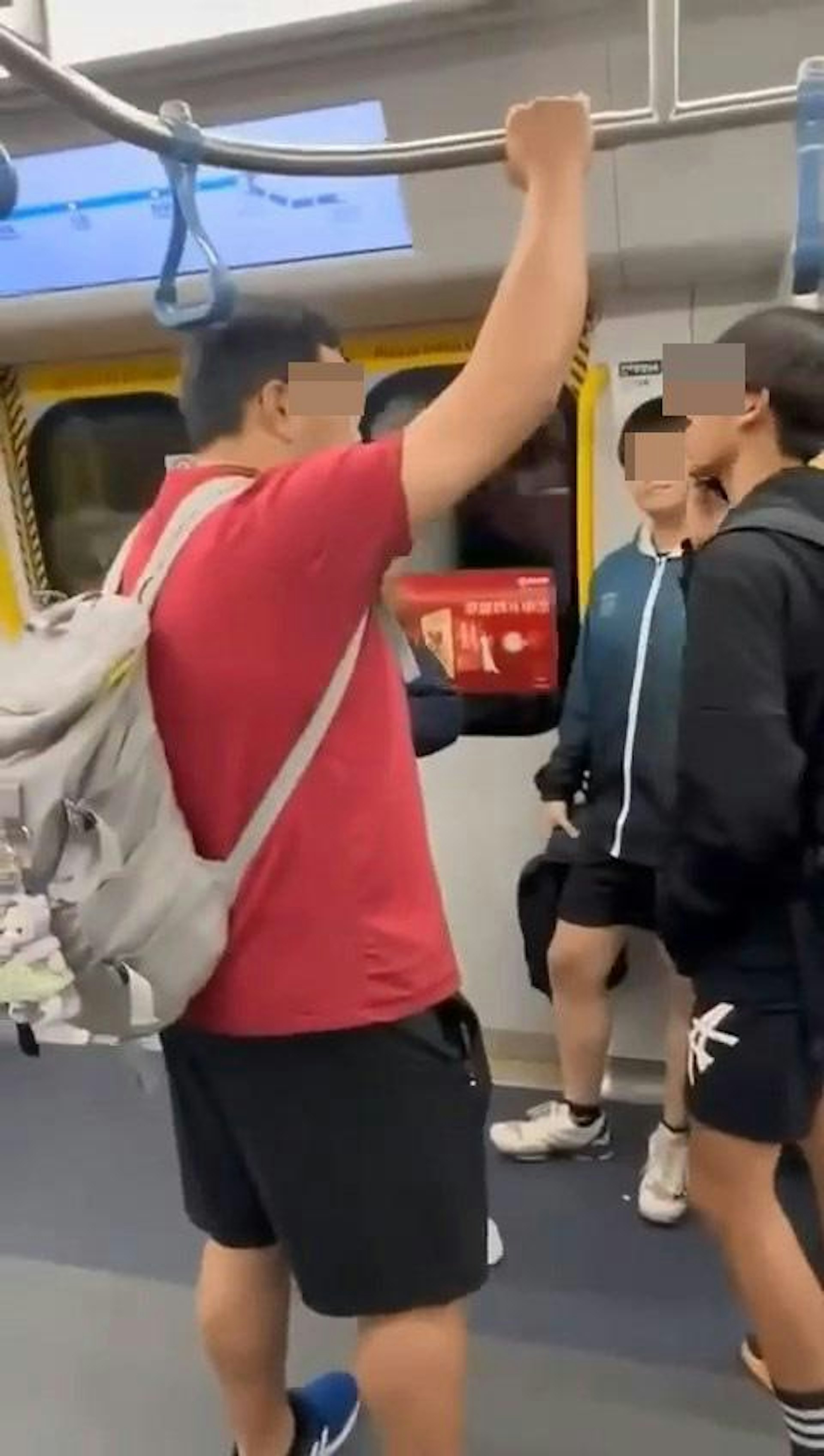 % I9 ~$ T5 Z! H, d影片見到,穿熱褲的港女正與穿紅色短袖上衣男友大聲喝罵1名男學生。(影片截圖)