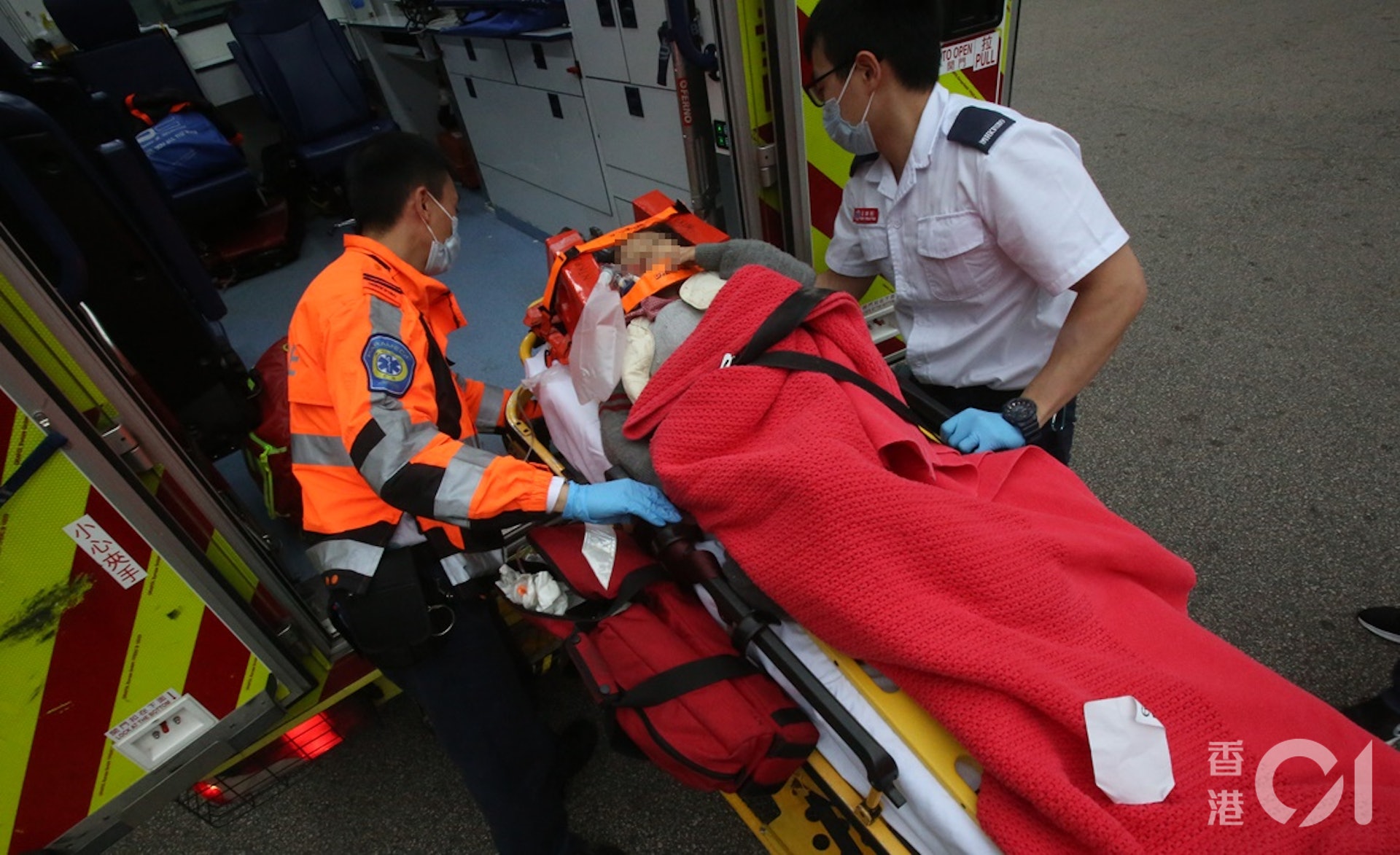 : p# r& I3 q! `" {受傷女童送院時鼻部滲血,需臥擔架床及戴上頭部固定器。(羅日昇攝)