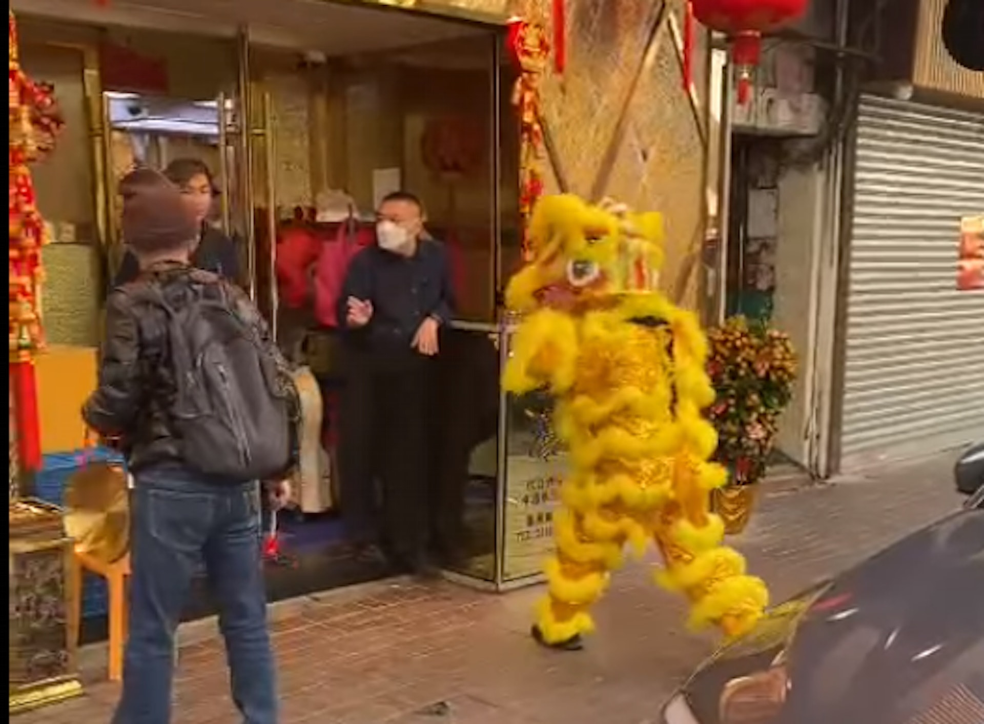 網上流傳的片段中,一名身穿黑衫頭戴冷帽的男子及一隻金黃色的「獅子」,兩人橫過馬路到一間家居百貨店門外疑逗利市,拍片者就笑指:「如果你揸架車,喺馬路見到隻咁嘅嘢,企喺度行,都幾恐怖!」。其後片段更拍得兩人到一間麻雀館門外逗利市,黑衫男負責敲鑼打鼓;另一人則負責舞獅,拍片者直斥:「乜咁都得嘅?」而竹館外的「泊車仔」就耍手示意趕走他們「喂,大佬呢度唔係食肆嚟㗎!」,黑衫男及舞獅男被拒後無奈離開,片段就此結束。
