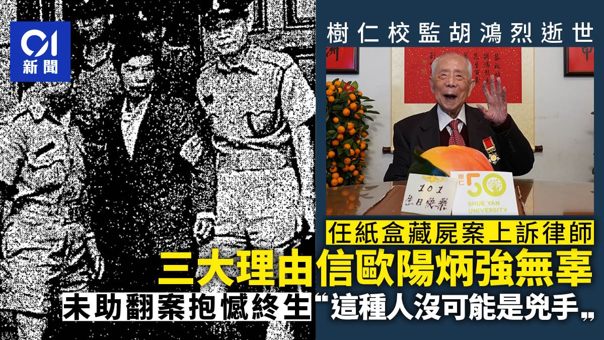 香港樹仁大學校監胡鴻烈昨日(28日)逝世,享年105歲,最為人熟悉的事蹟為創辦香港第一間私立大學——樹仁大學的前身樹仁書院。作為著名大律師的他,亦曾任70年代紙盒藏屍案被告歐陽炳強的代表律師。在歐陽炳強上訴期間至刑滿出獄,胡鴻烈多次公開表示堅信他無罪,稱「這種人當然沒有可能是兇手」,甚至因為未能協助他翻案而抱憾終生。) W) R) v3 J% O. a7 Z) t1 n- E' c