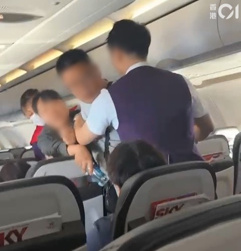 香港航空今日(8日)有一架由香港飛往韓國首爾的HX628航班,有4名男女乘客在爭執推撞。(讀者提供影片截圖)
