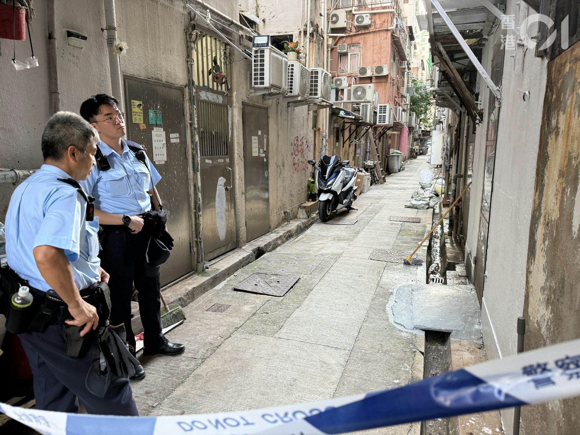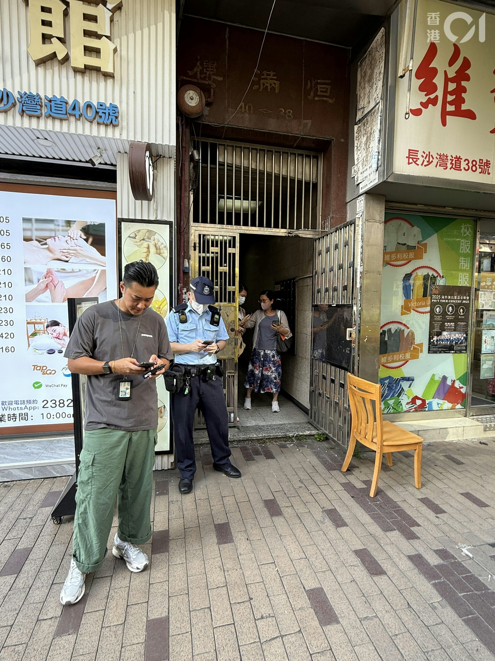 現場為深水埗長沙灣道38至40號恒滿樓;有社工在場協助調查。(戴慧豐攝)