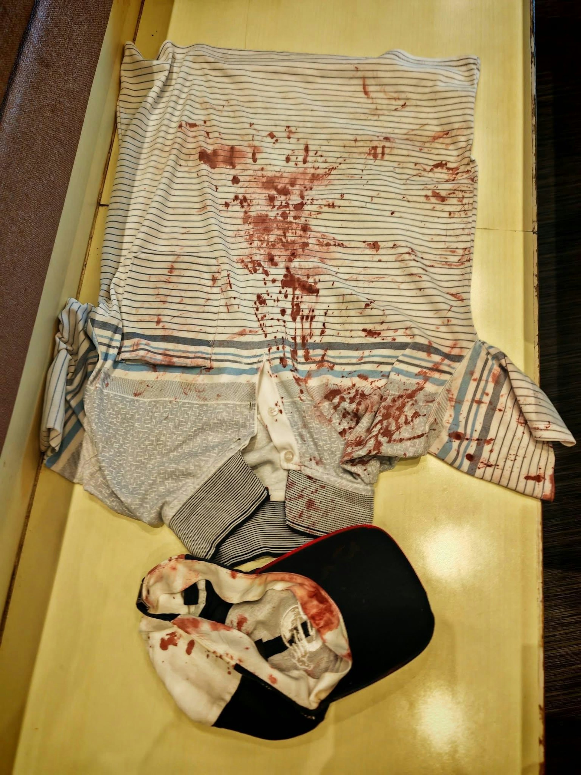 事主女兒發交貼上其父親被拳毆後染血的衣物。(fb/聯和墟的生活點滴 joan leung)