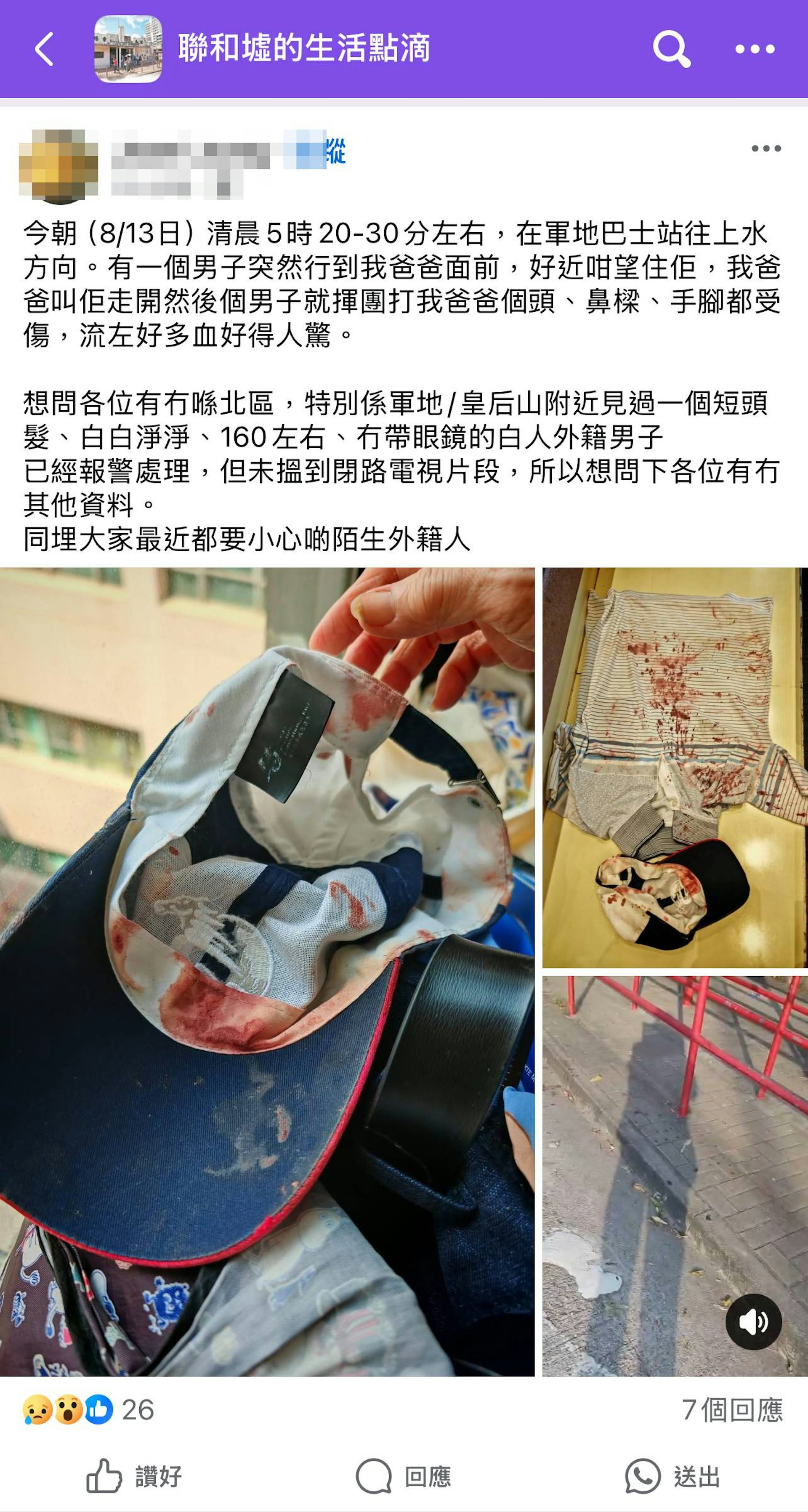 ( \' H# E( u A: O. f事主女兒事後在facebook發文指,約清晨5時半左右,在軍地巴士站往上水方向,一名男子突然走到其父親面前,並「好近」看着他,該男子突然揮拳打人。她續稱,其父頭、鼻樑及手腳均受傷流血,又呼籲市民大眾要小心陌生外籍人。帖文圖片可見,老翁所穿戴的帽及衣服均染上鮮血。