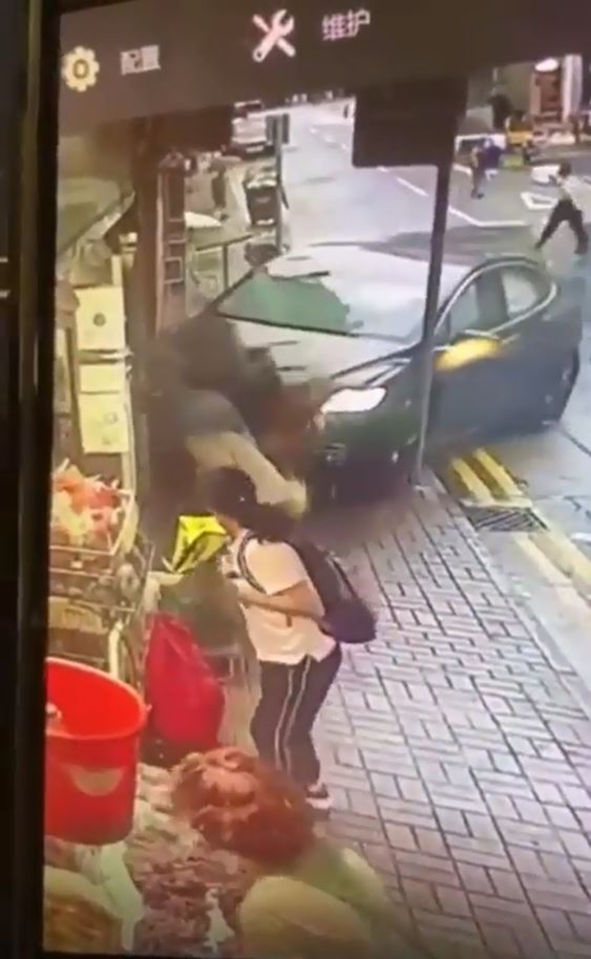 水果店門前的老翁同樣被撞飛。(網上車cam片段截圖) |