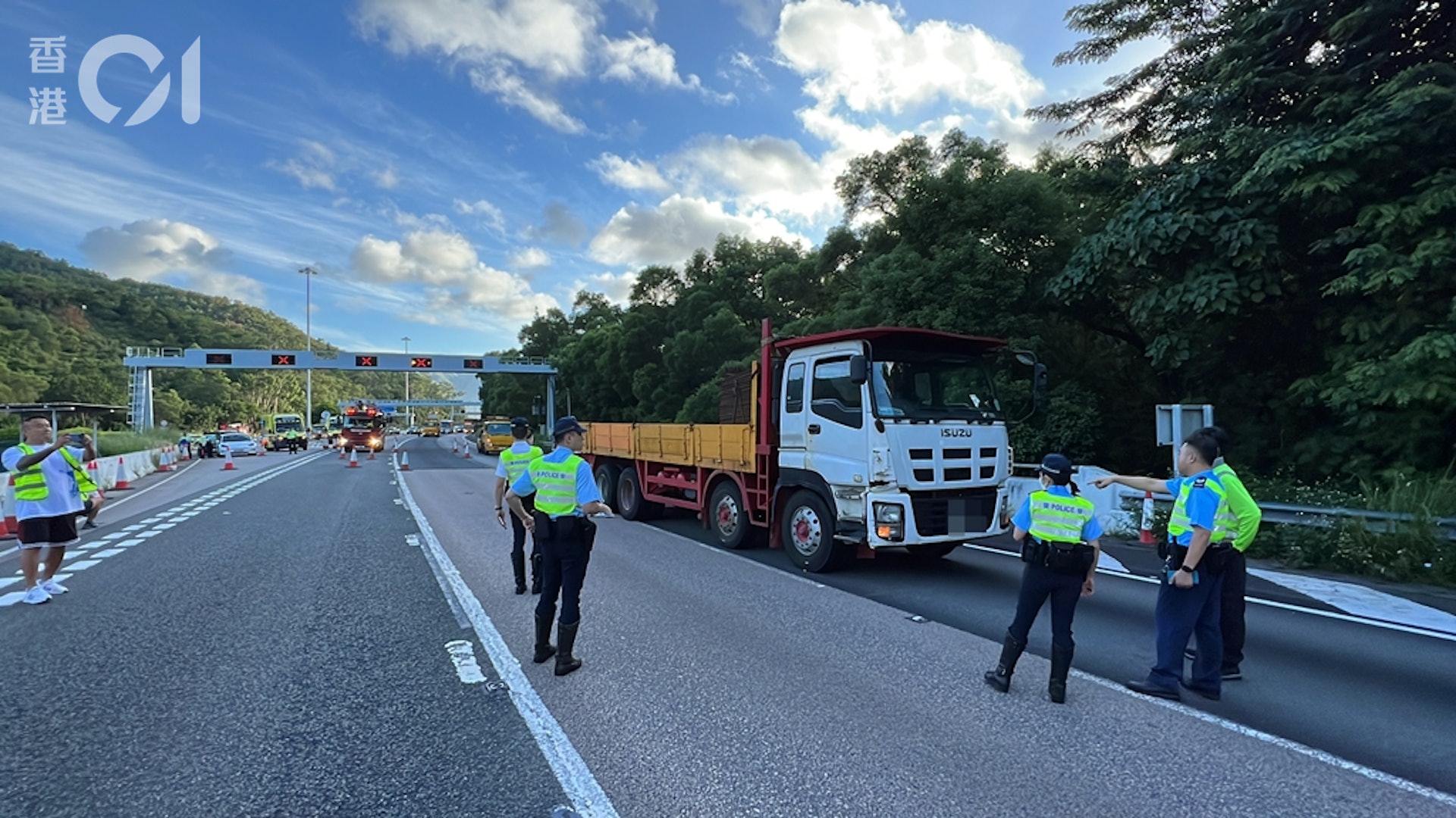 較早前一架TESLA與寶馬私家車,經過大欖隧道收費亭相撞。兩車相撞後繼續向前行,駛至避車處。寶馬司機步出車之際,被從後駛至的重型貨車撞倒重創。(翁鈺輝攝)