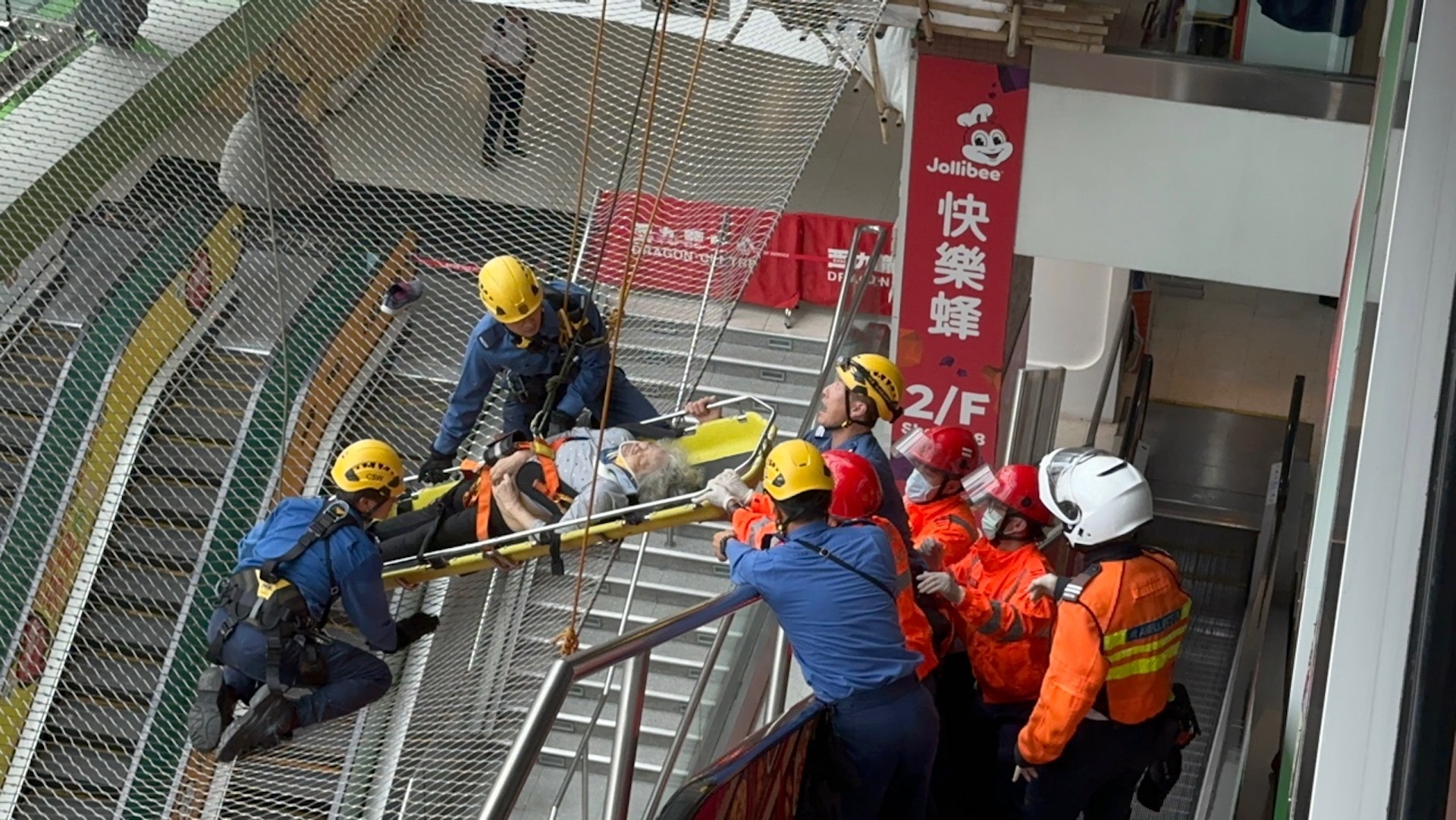 : O t8 F1 m! Q& j老婦跌在安全網內。(林澤鋒攝)