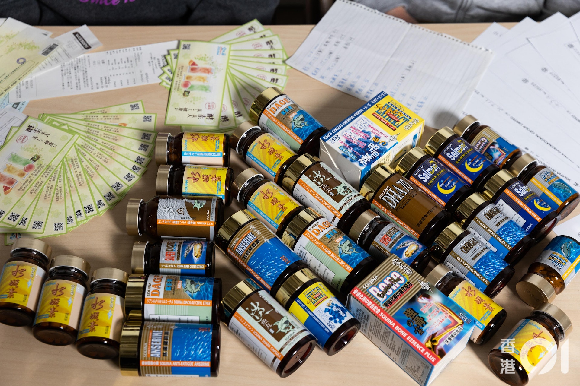 十年來婆婆到底買了什麼?光是魚油產品已有六種,明目產品亦有兩款,還有其他丸仔、酵素飲品。這些保健品聲稱,可以提高免疫力、安睡、強骨、補腦、護肝補腎,甚至是減低頑疾細胞指數和抗輻射。