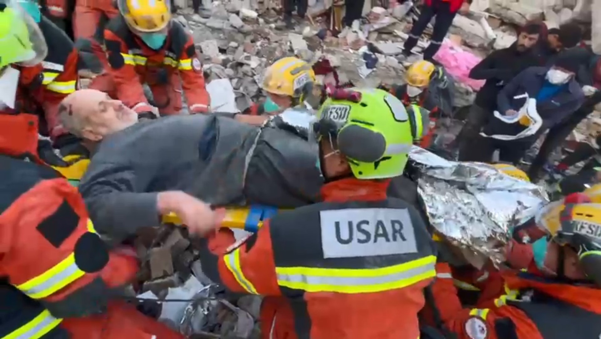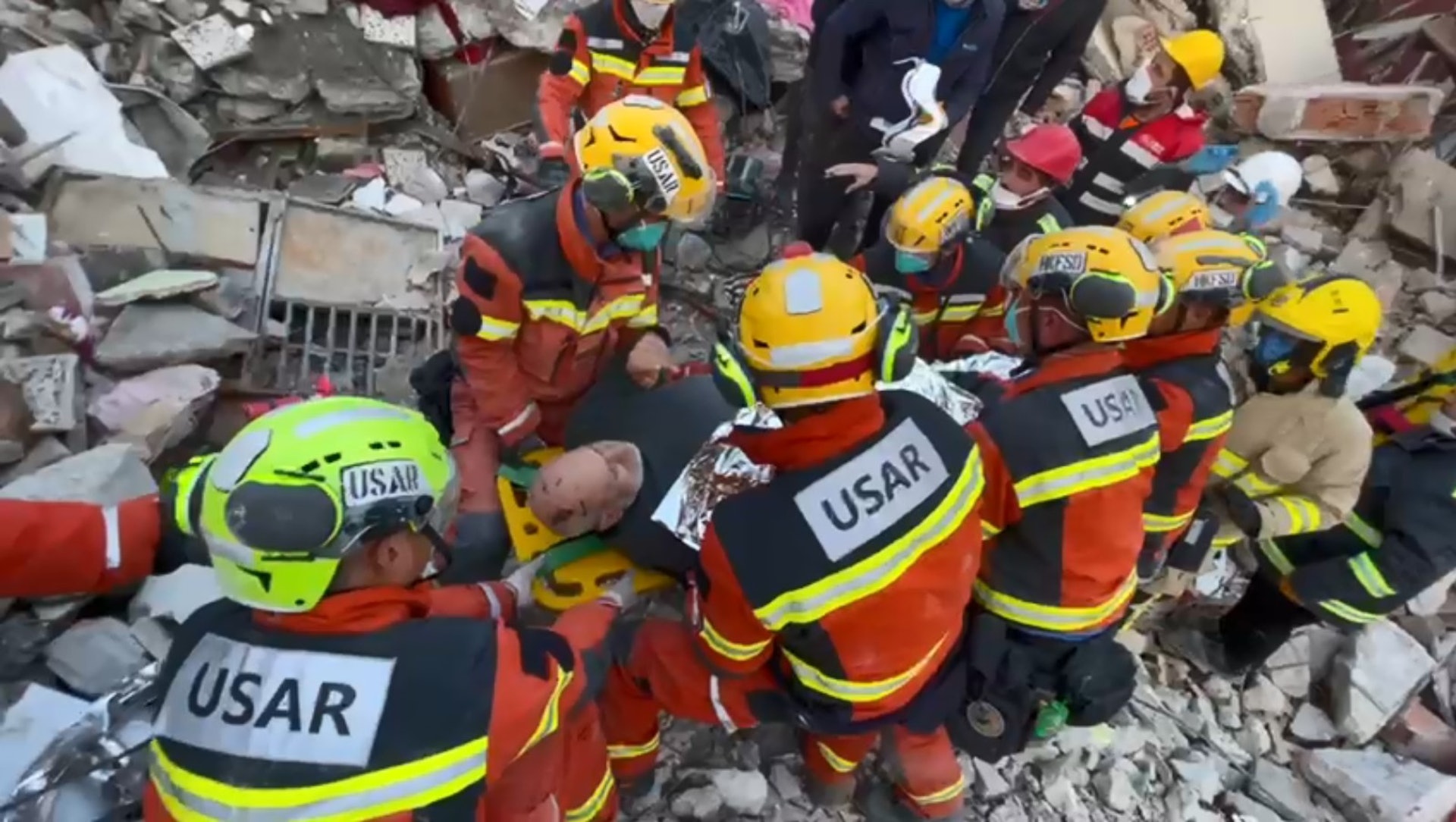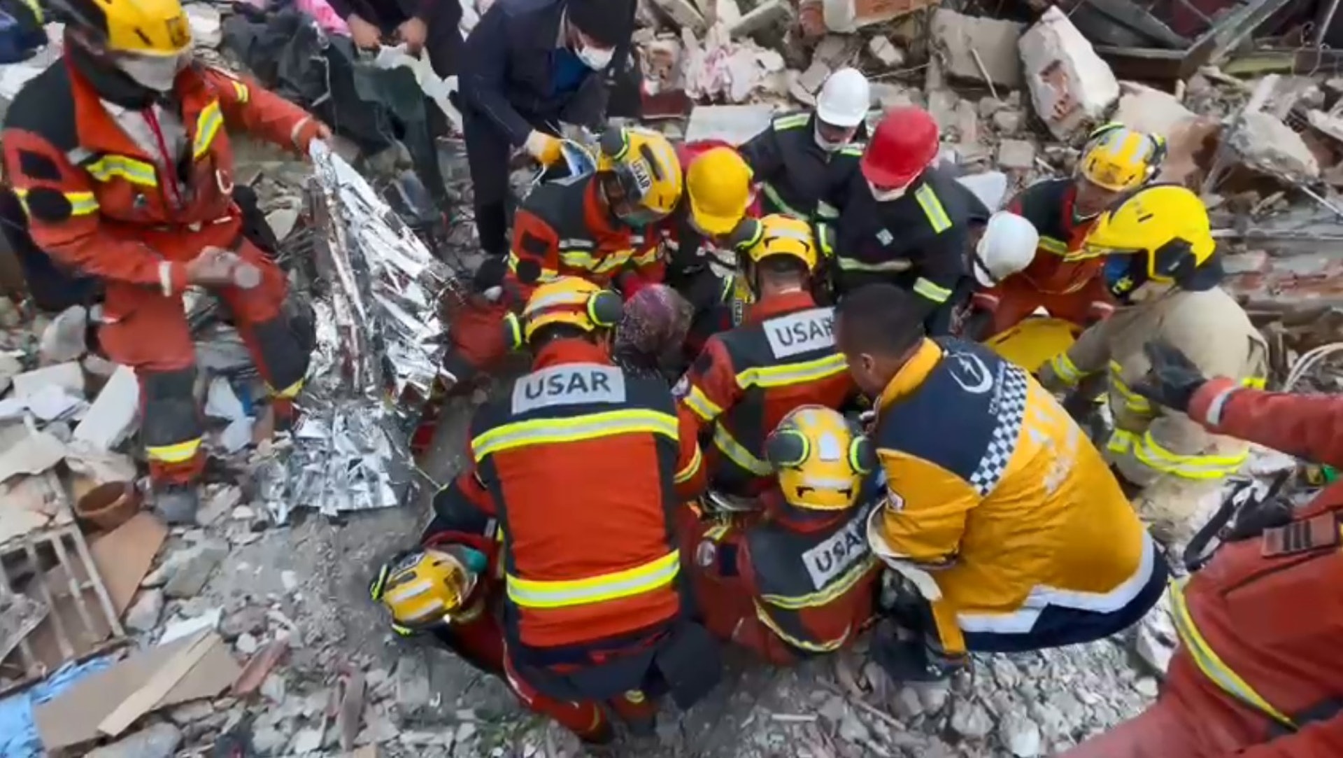 香港特區搜救隊人員在土耳其地震災區瓦礫下,救出3名生還者,圖為首名被救出的女子。(消防處提供)
