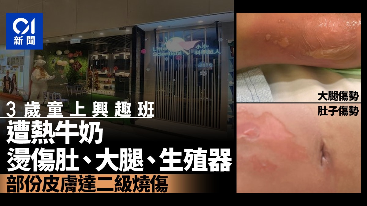 1 i% ~1 r/ A0 f$ K# y, d3 @公仔箱論壇家長陳小姐帶3歲兒子到一間教育機構黃埔分校上興趣班,豈料兒子在上課途中被滾燙的牛奶燙傷肚、大腿及生殖器,部分皮膚達二級燒傷,「小朋友每次都喊到好似劏豬咁。做阿媽嘅,心都碎喇。」