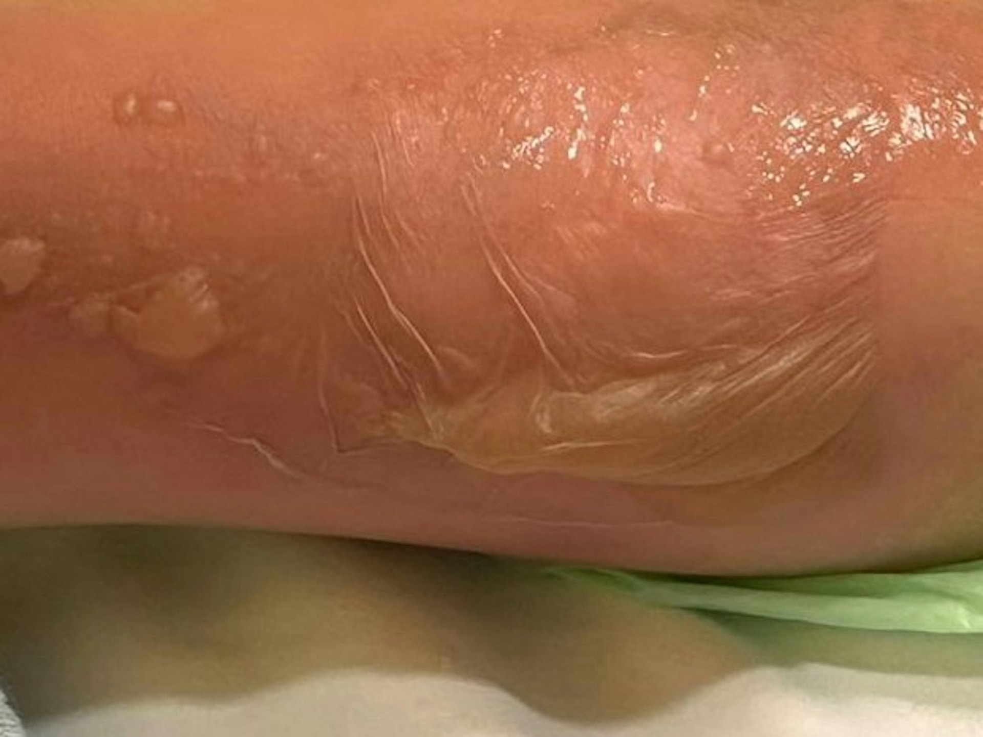 陳小姐的3歲兒子左大腿嚴重燙傷起水泡。(陳小姐提供圖片)