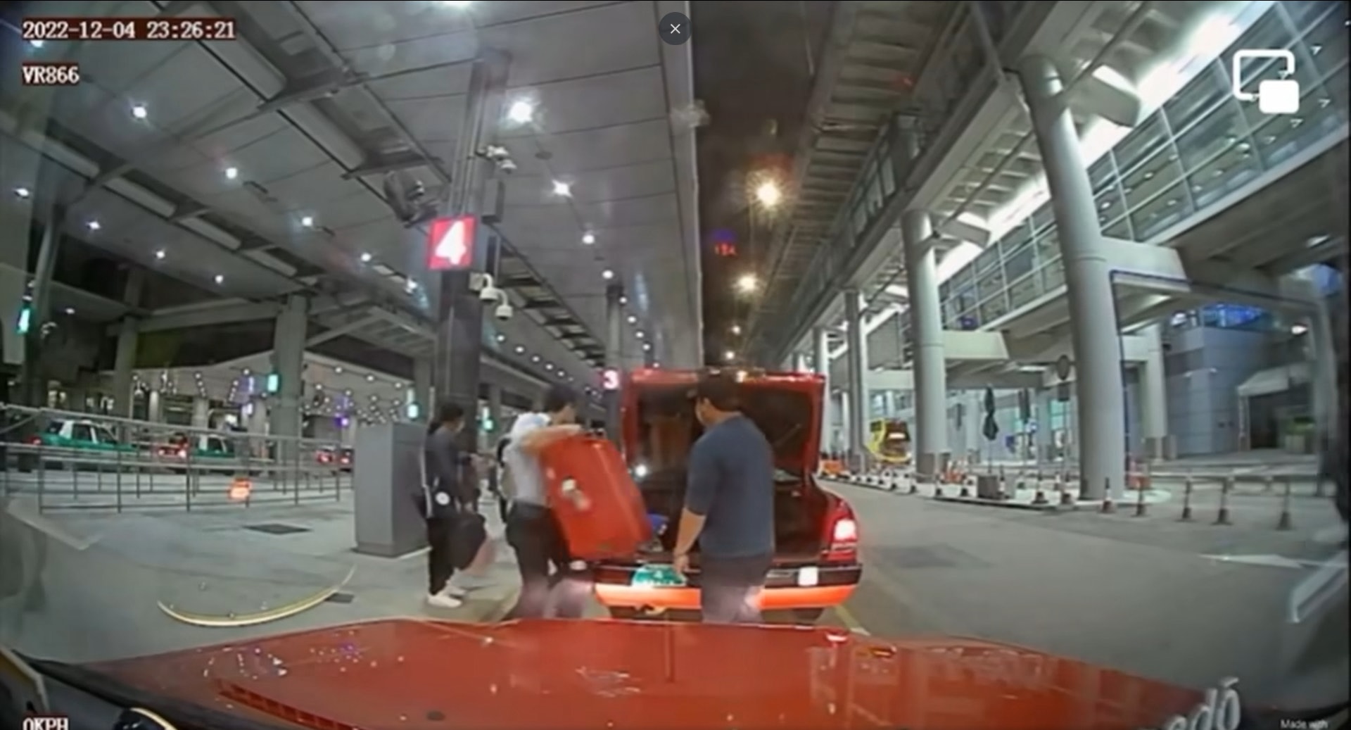 5 u; E" D. O' ^0 S: z公仔箱論壇網上流傳一段行車記錄儀影片(車CAM),片段顯示,上周日(4日)晚上11時27分機場的士候車區,一名的士司機在車尾箱擺放乘客行李時,後方的士突然衝前,將他如三文治般夾在兩車之間,同時又被塌下的車尾冚砸中。途人及機場職員見狀立即協助倒車救出司機。