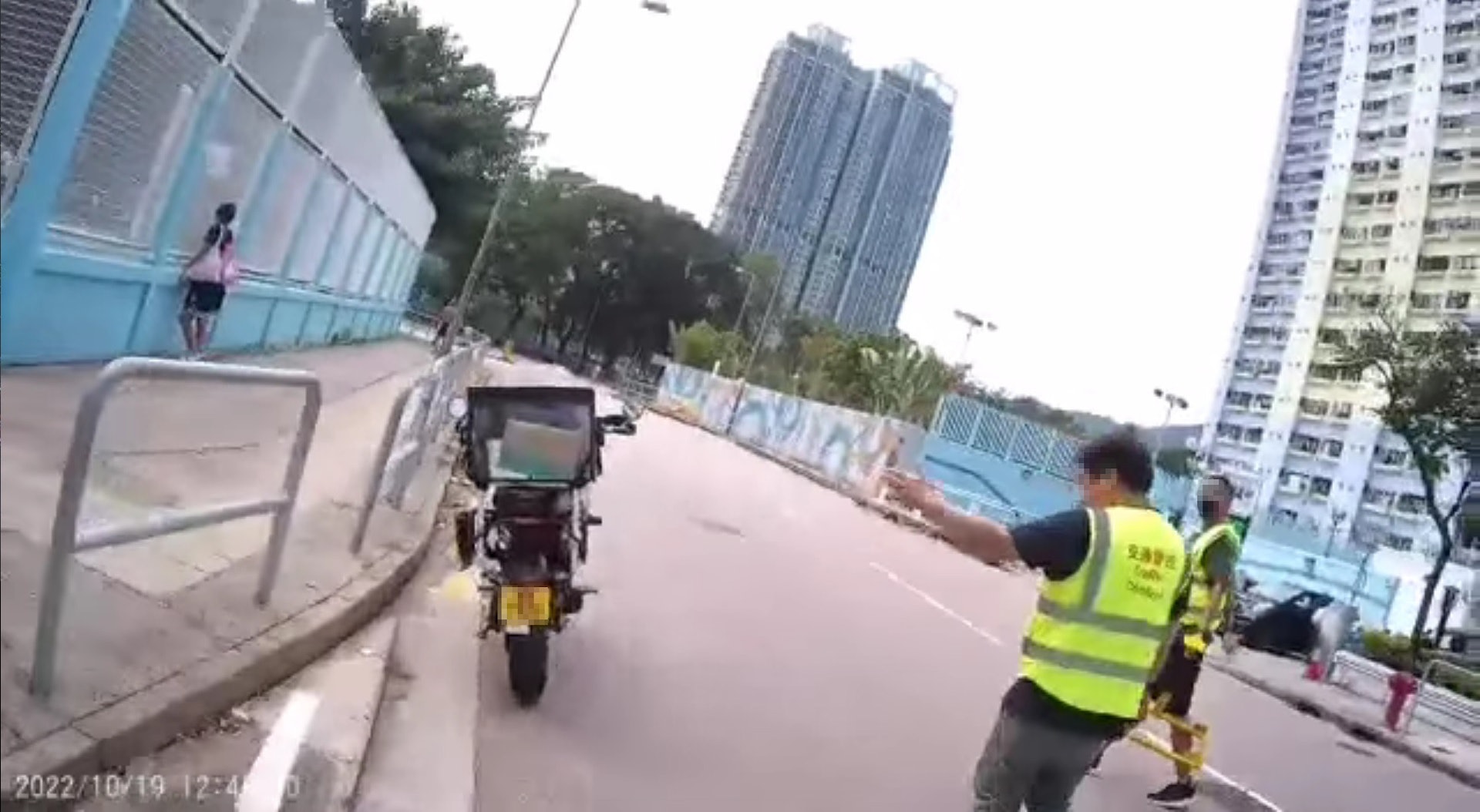 有外賣員昨午(10月19日)於沙田乙明邨對面小學送外賣,短短23秒遇上鎖車隊上前欲鎖車。(fb專頁「香港鐵騎館」影片截圖)公仔箱論壇- [$ z; l& }8 c. J( y2 V